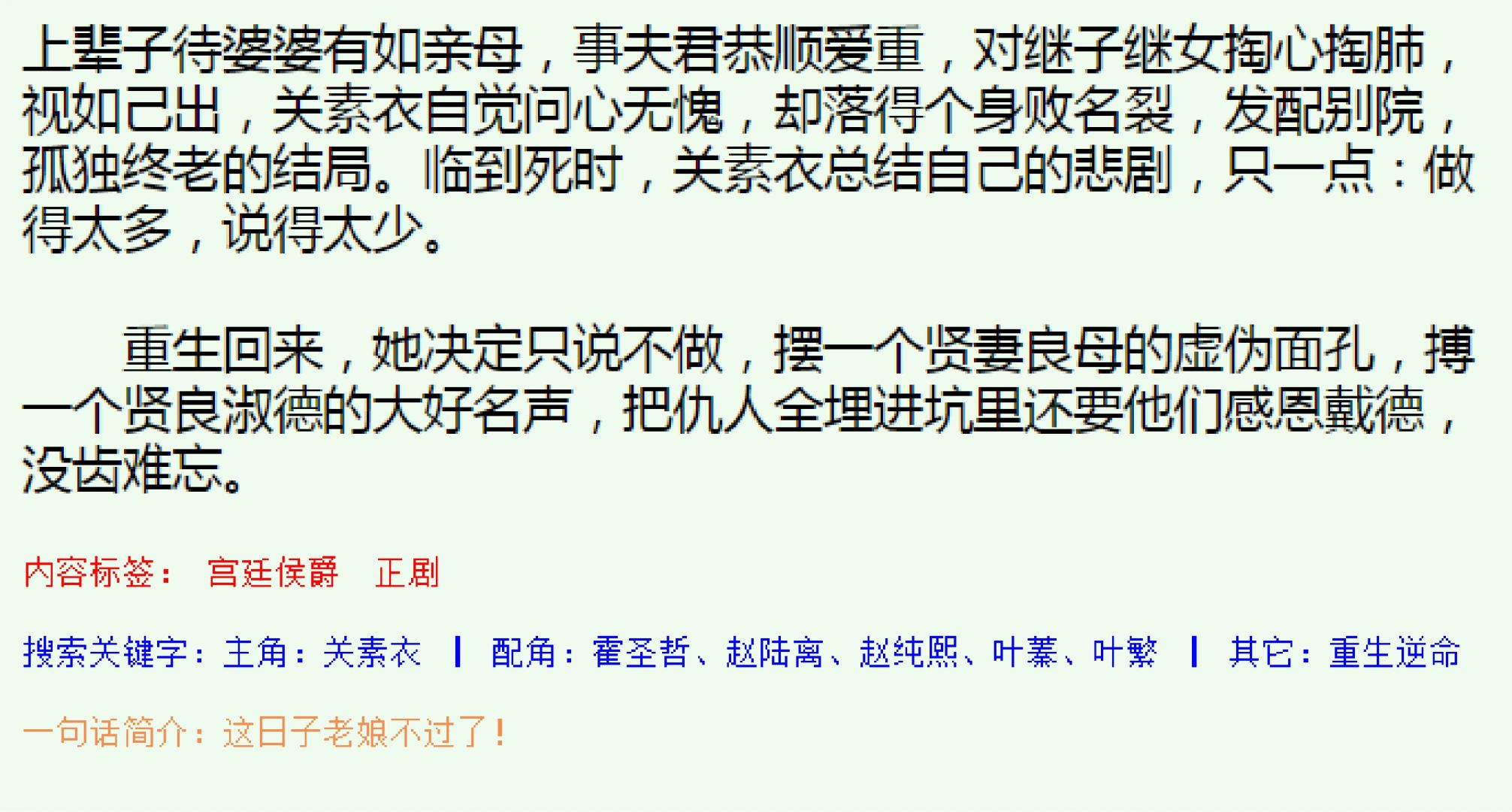 [火R][火R]这一世母家未没落,不用女主延医请药,贴补家用,女主关素衣家风正派,祖父和父亲均有经世大才,未被徐氏做踏脚石身败名裂,获得了重用。女主的才华横溢更是深深吸引皇帝,追妻火葬场。