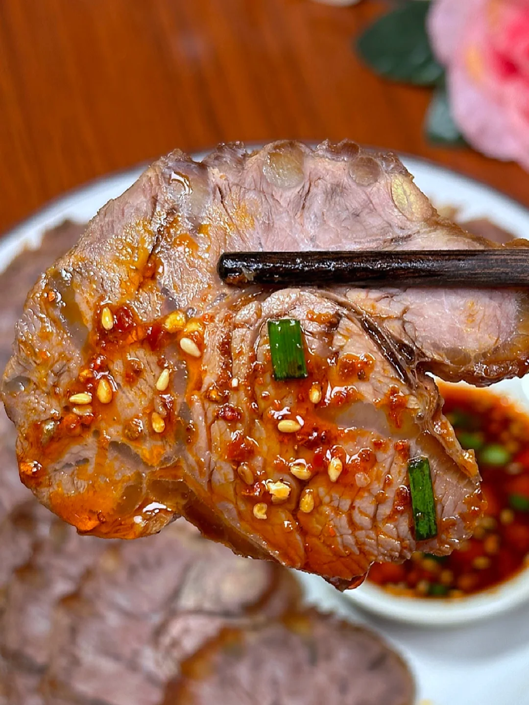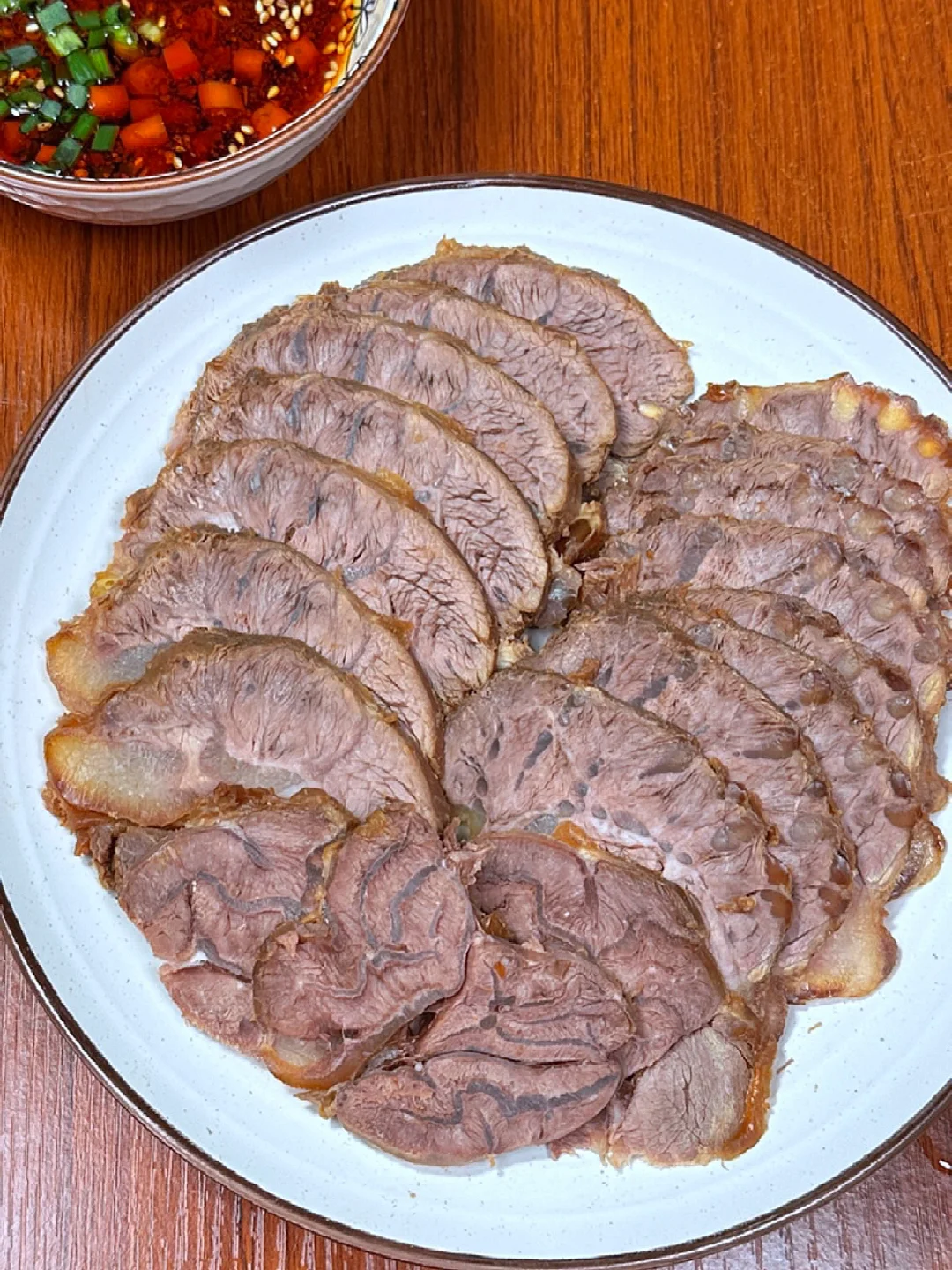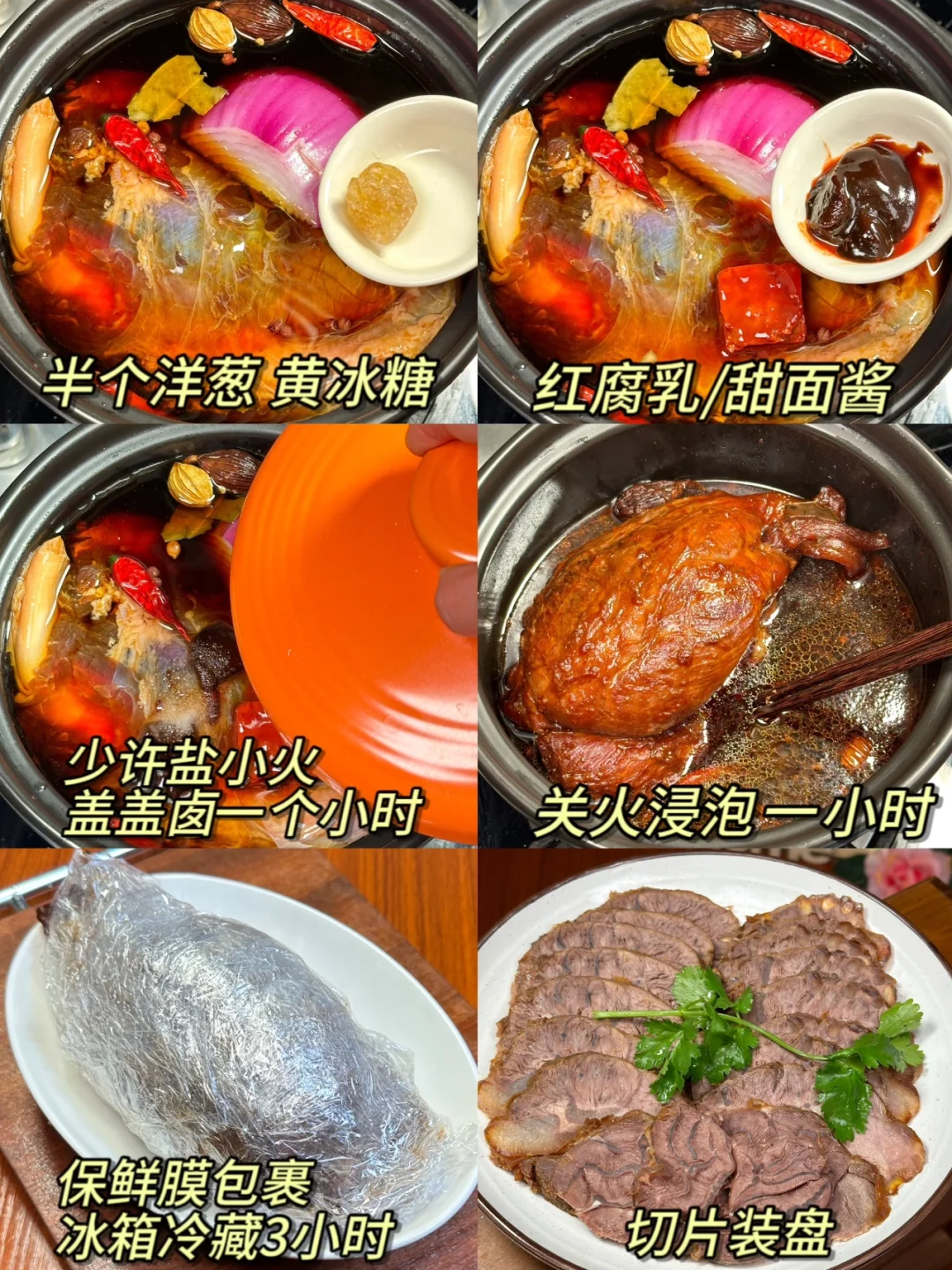 2️⃣炖锅内倒入适量清水没过牛肉,调味加一勺甜面酱,一块红腐乳,半个洋葱,少许盐,盖盖小火卤一个小时,筷子🥢能轻松穿透说明熟了,然后关火静置一个小时,冷却后裹上保鲜膜冰箱冷藏3小时再切片装盘,搭配点蘸料汁,特别好吃下酒又下菜👍