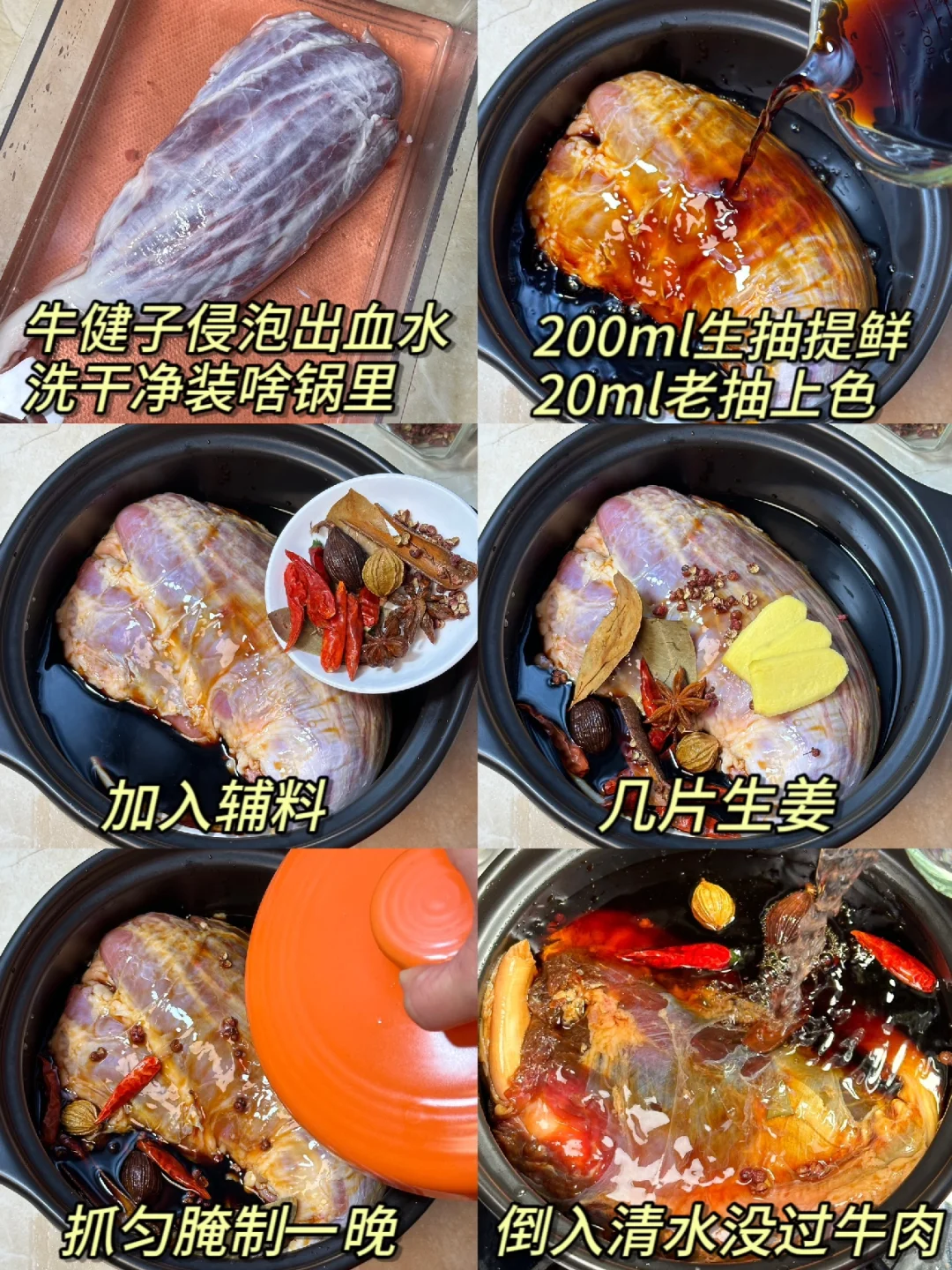 🌿🌿做法:1️⃣牛健子提前浸泡血水(至少3小时以上)清洗净放沙锅内,倒入200ml生抽,20ml老抽上色,加辅料:2个八角➕桂皮➕香叶➕草果➕砂仁➕花椒粒➕干红辣椒➕几片生姜,抓匀后盖上盖子腌制一晚(这样更入味)