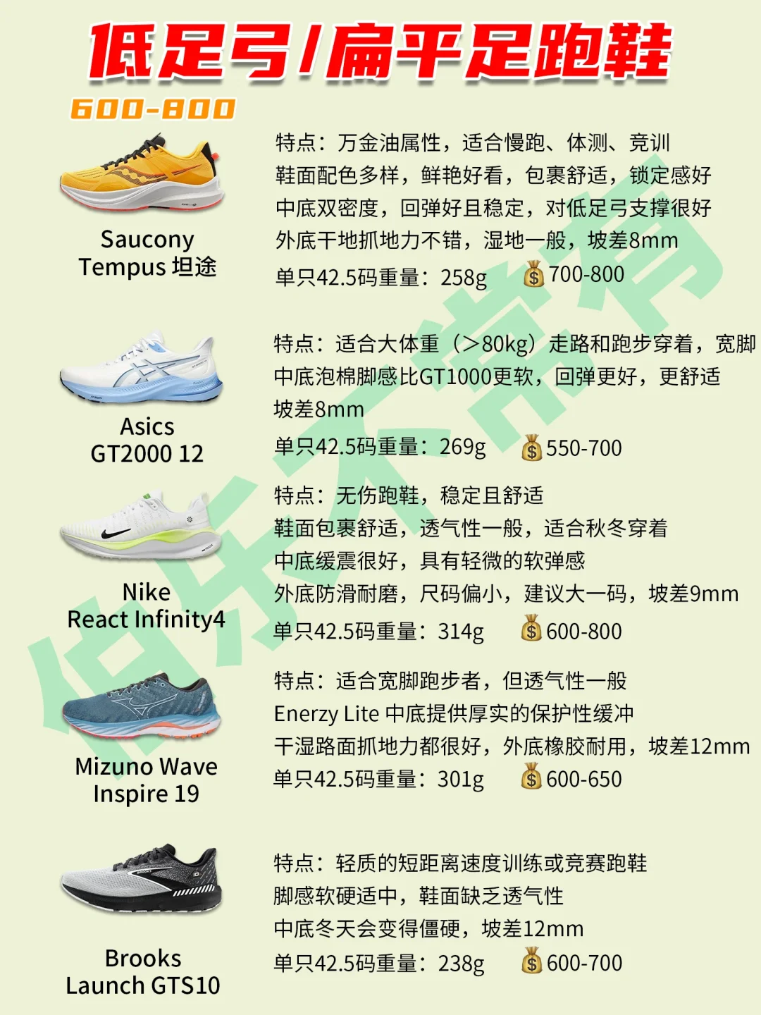 低足弓跑者的脚又平又软,刚性弱,易产生过度内旋的情况,容易导致足底筋膜、胫骨、脚踝损伤。需要稳定支撑系的跑鞋鞋去纠正落地步态。让走路奔跑更轻松、更健康!