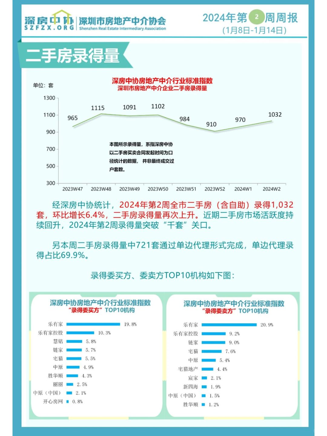 深房中协数据:2024年1月15日,深圳全市有效在售二手房源57758套,在售二手房源比上周减少51套,在售房源正常波动中。上周(1月8日-1月14日)全市二手房录得1032套,比上上周增加62套,二手房录得量连续两周波动回升。 深圳二手房在售房源和录得量都处于筑底波动中,后期市场走势有待观察。
