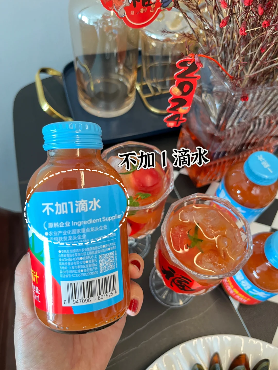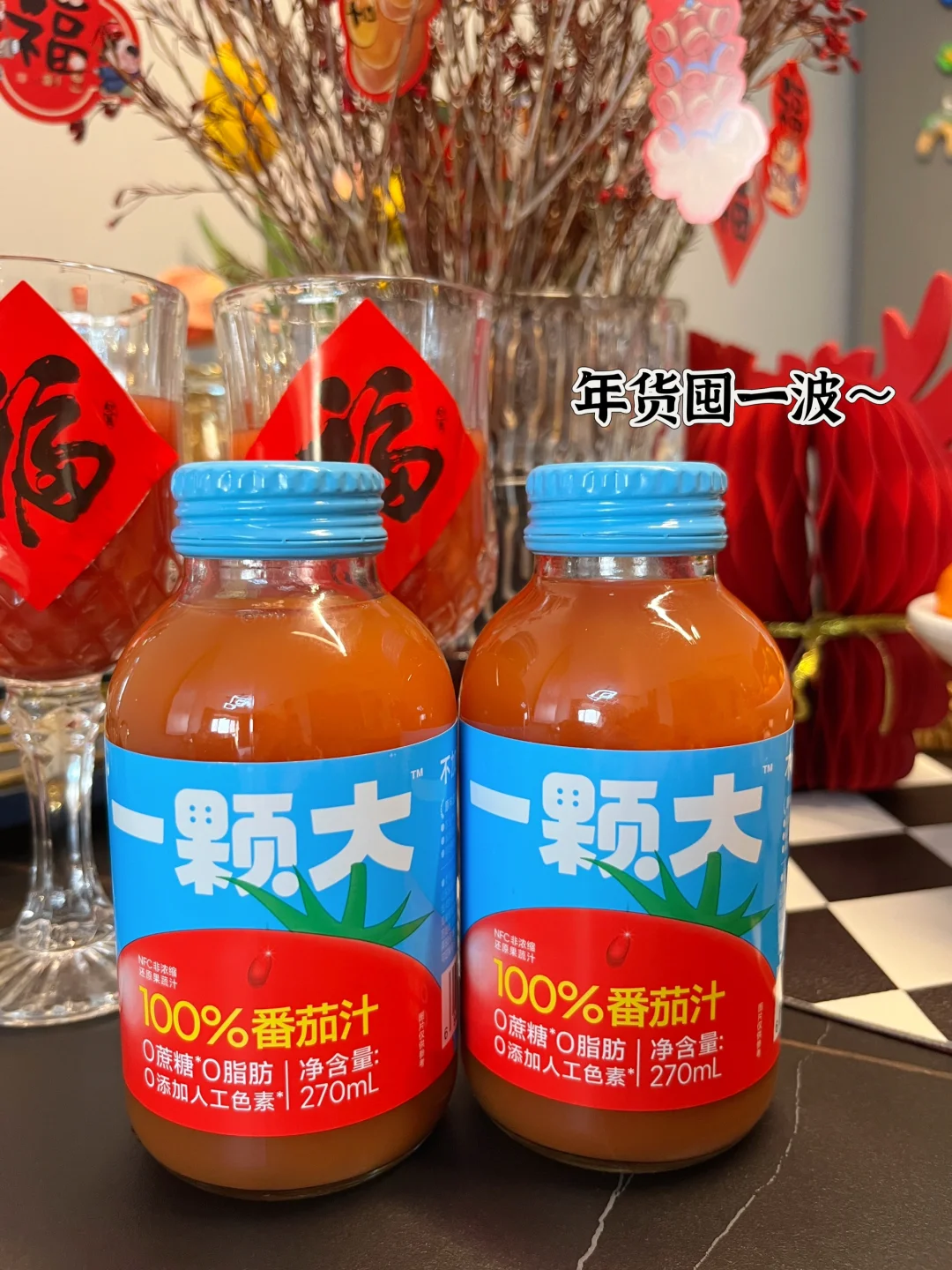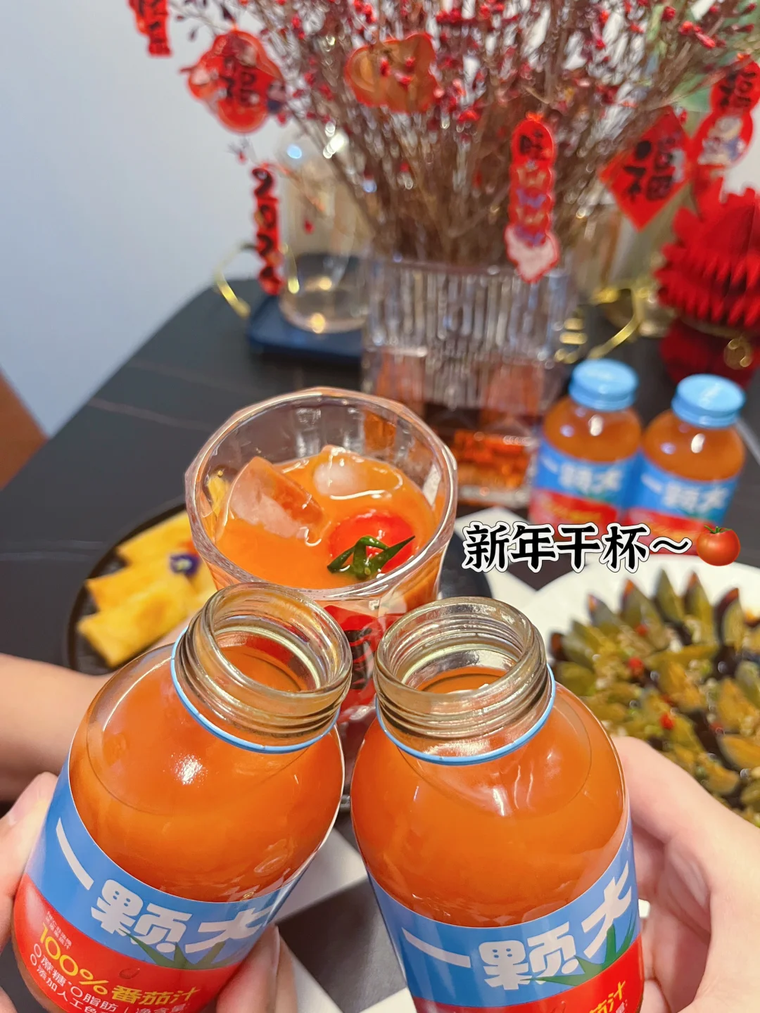 新年聚餐是离不开饮料哒,都知道日常会喝一些橙汁、椰奶这些,都比较甜腻,我今天准备的是一颗大番茄汁也是我日常就喜欢喝的,酸酸甜甜的味道,这不过年了嘛,聚餐时难免大鱼大肉吃多的时候,喝它就chao解腻!可别小看这一小瓶, 大大能量,约3.5个番茄的丰富营养,满满vc,喝起来就像是在吃鲜番茄一样,主要是一滴水都不加,就是这么硬核!而且没有乱七八糟的添加全家老少皆宜,今天也给朋友种草了,趁年底冰箱要多备一些,我个人更喜欢加点冰块再喝,入口清清爽爽好爱!