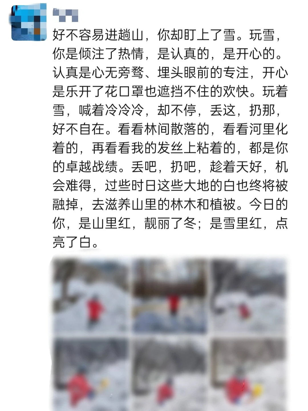 好不容易进趟山,你却盯上了雪。玩雪,你是倾注了热情,是认真的,是开心的。认真是心无旁骛、埋头眼前的专注,开心是乐开了花口罩也遮挡不住的欢快。玩着雪,喊着冷冷冷,却不停,丢这,扔那,好不自在。看看林间散落的,看看河里化着的,再看看我的发丝上粘着的,都是你的卓越战绩。丢吧,扔吧,趁着天好,机会难得,过些时日这些大地的白也终将被融掉,去滋养山里的林木和植被。今日的你,是山里红,靓丽了冬;是雪里红,点亮了白。