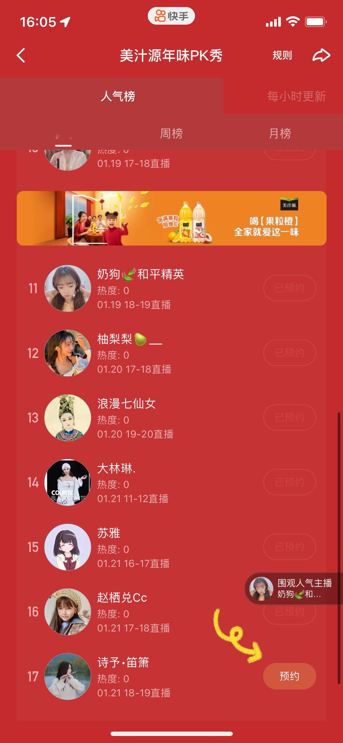 美汁源的年味PK秀正在快手上火热进行中!有17位各地代表的村花,在这里等你来支持!#美汁源过年就爱这一味#我们这边过年最特别的就是要吃甜粿、发粿、松粿,每一种都是不一样的味道哦!有时候还会一家人在年桔上装饰灯笼、利是,希望来年大吉大利,财源滚滚!朋友们,赶快来直播间找我,来看广府村花主播诗予.笛箫—笛子演奏