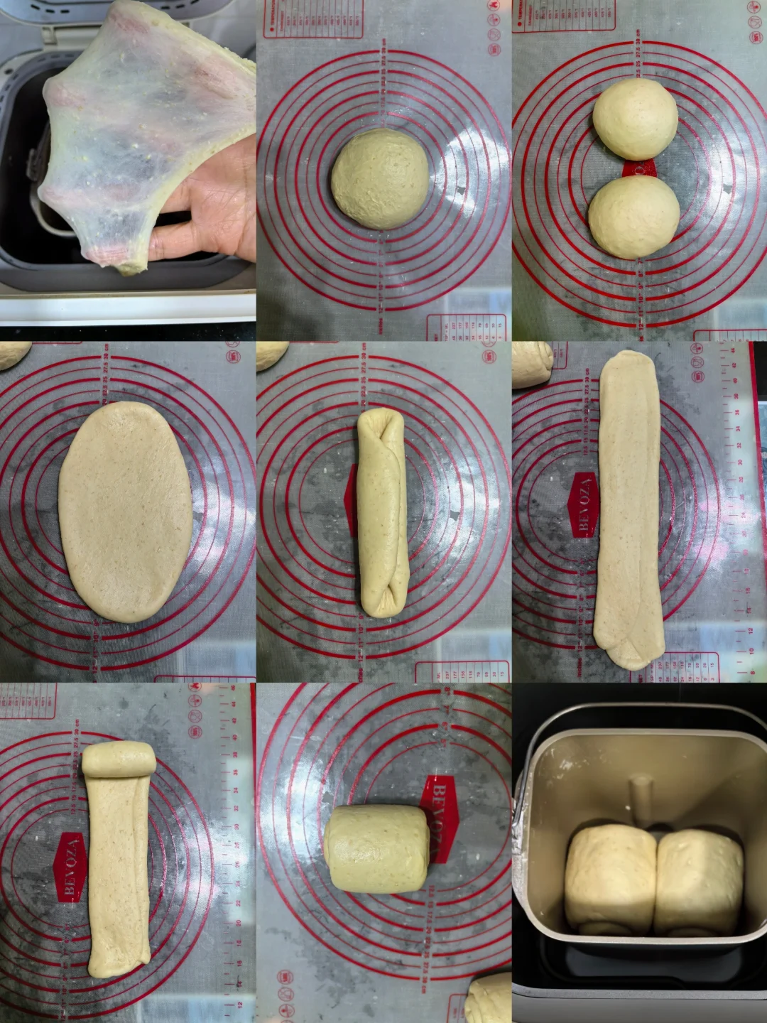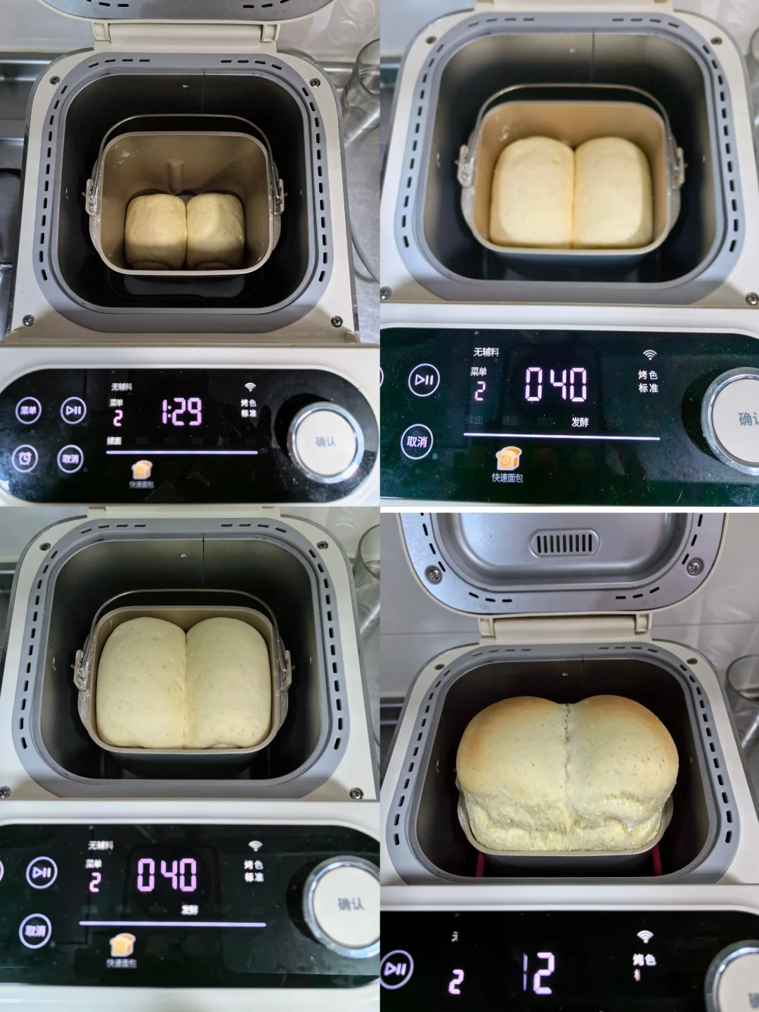 海氏和松下采用一键式“快速面包”菜单来做,只需多加一个10分钟的揉面菜单,如果偷懒,无需整形,全程不用手碰面团,如果像我一样追求完美,可以在“快速面包”菜单运行到离结束还有1:29分时按下暂停(海氏面包机),拿出整个型,也很方便。2个多小时就可以得到一个满意的面包,有图有真相。