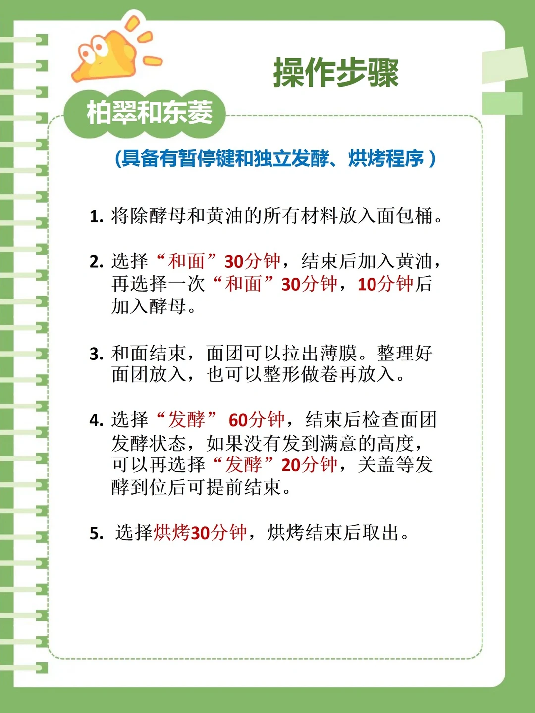 柏翠和东菱面包机的操作步骤也在附图中, 由于有独立的和面、发酵和烘烤功能,操作也很方便。