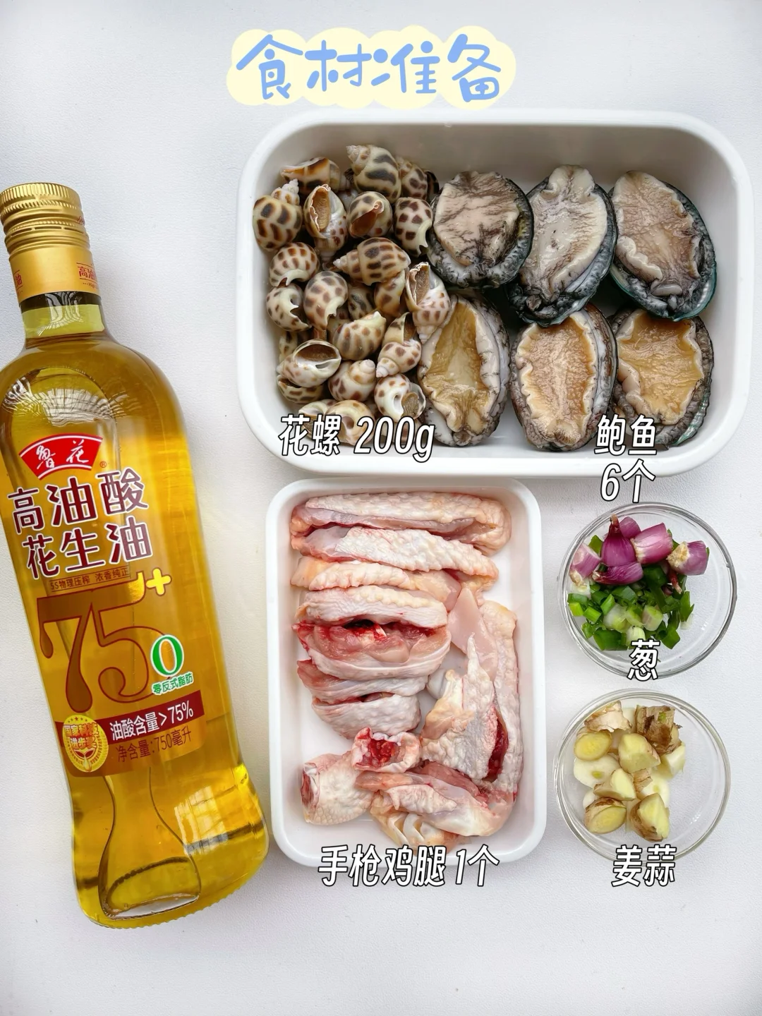 📝【食材】:鲍鱼,花螺,鸡腿,姜葱蒜