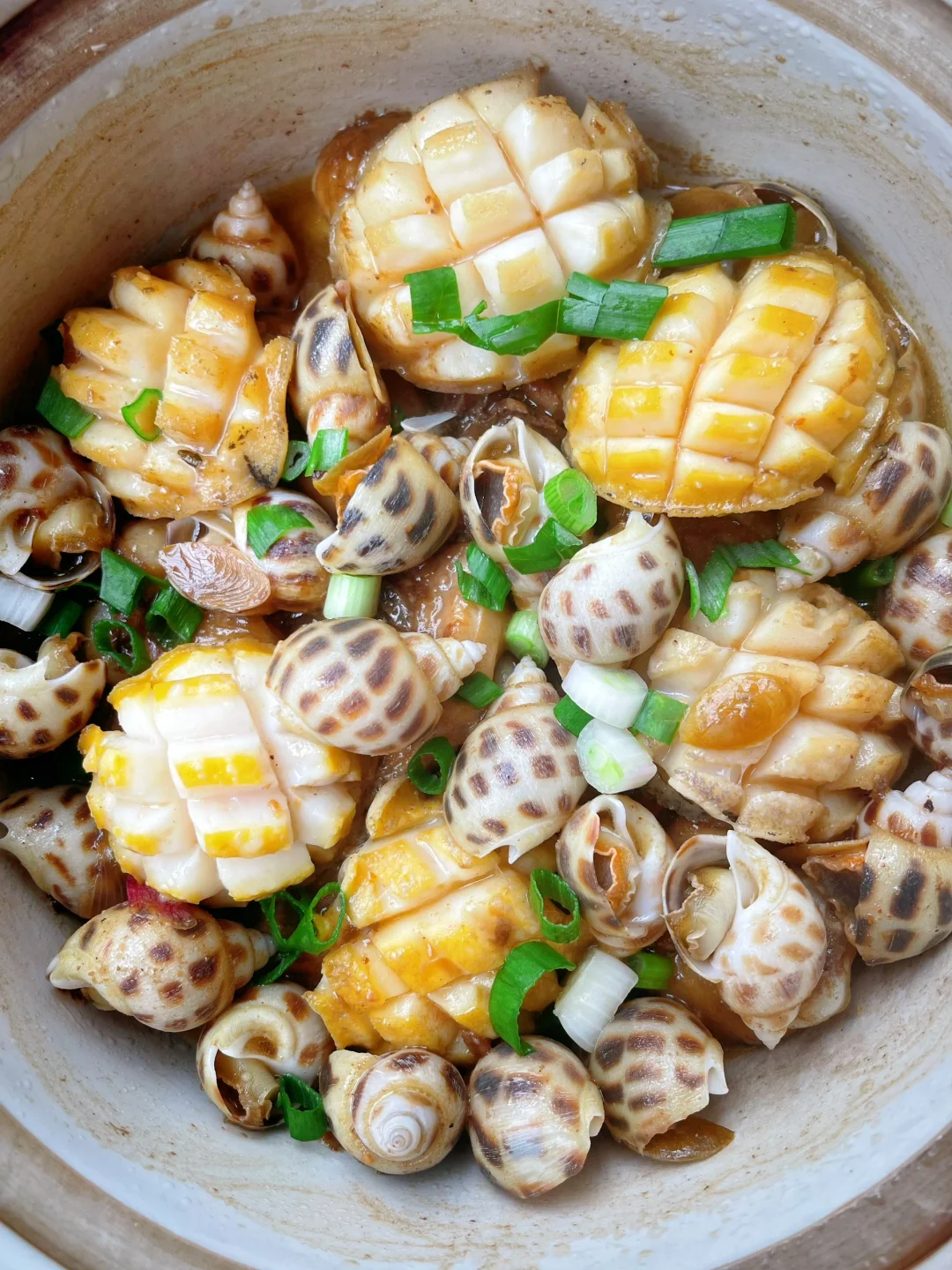 4️⃣倒入花螺,+1勺生抽+1勺柱候酱+半碗水,加盖再焖5分钟,撒上迷人的小葱花即可✅