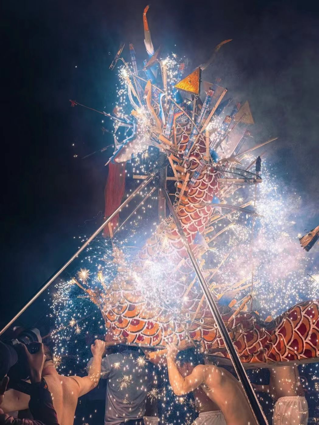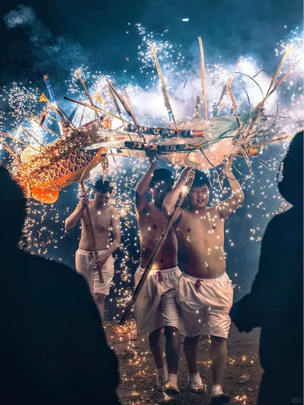 丰顺埔寨火龙,是国家级非物质文化遗产之一 每逢元宵节🏮,埔寨镇村民便举行烧火树、烧禹门、烧火龙等民间烟花艺术表演 以祈求新的一年风调雨顺,五谷丰登,岁岁平安 在烧火树、烧禹门结束后便是烧🔥🐲啦 舞龙人在七彩光焰中娴熟地“驭龙”,蜿蜒翻腾 犹如神龙🐉天降,气势恢宏、动人心魄 一条火龙通常需要几十个青年🙋♂赤膊上阵 承受着火花四溅的灼痛感 如若在你的皮肤上烫起了泡 那没准明年你会发大财啦💸 因为在当地口音中水“泡”与钞“票”同音 身上被烫起泡则寓意着来年钞票多多💰