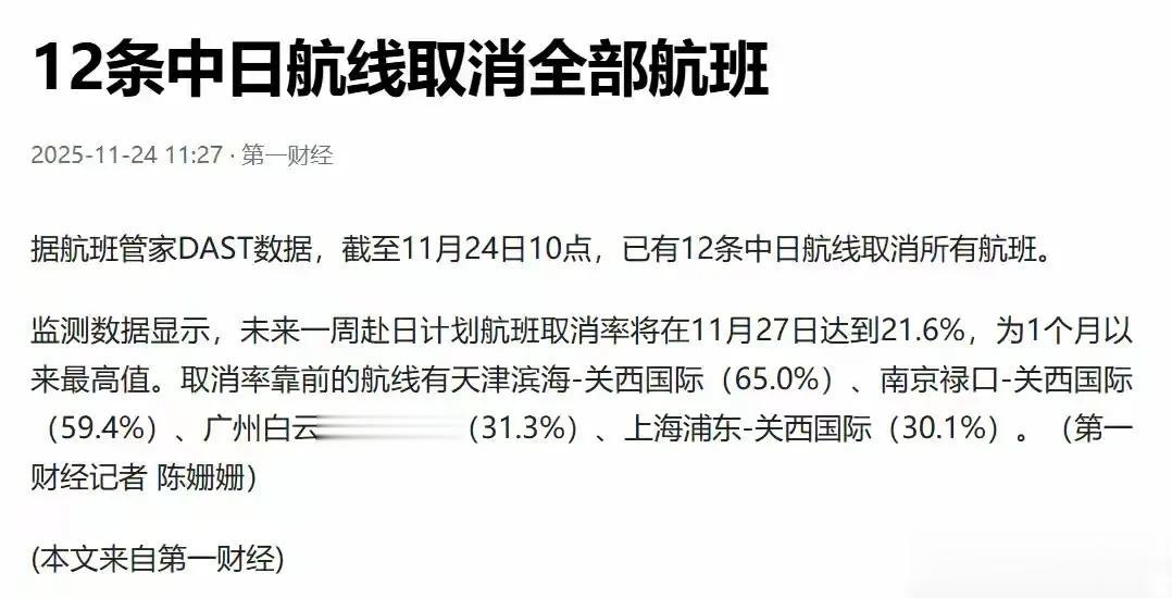 除了上述反制,截止11月24日10点,已有12条中日航线取消所有航班,涉及名古屋、福冈、札幌、大阪等地,都是日本的大城市。此前中方已发出中国公民谨慎赴日旅游和留学的提醒,现在12条中日航线取消所有航班,对日本旅游业来说,将是一个重击,对日本经济的影响是不断加深的。