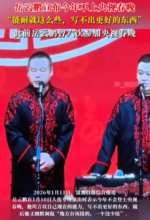 1月10日晚上,岳云鹏在大连的专场演出上,突然当着全场观众的面说了一句话:今年不会出席央视春晚了。