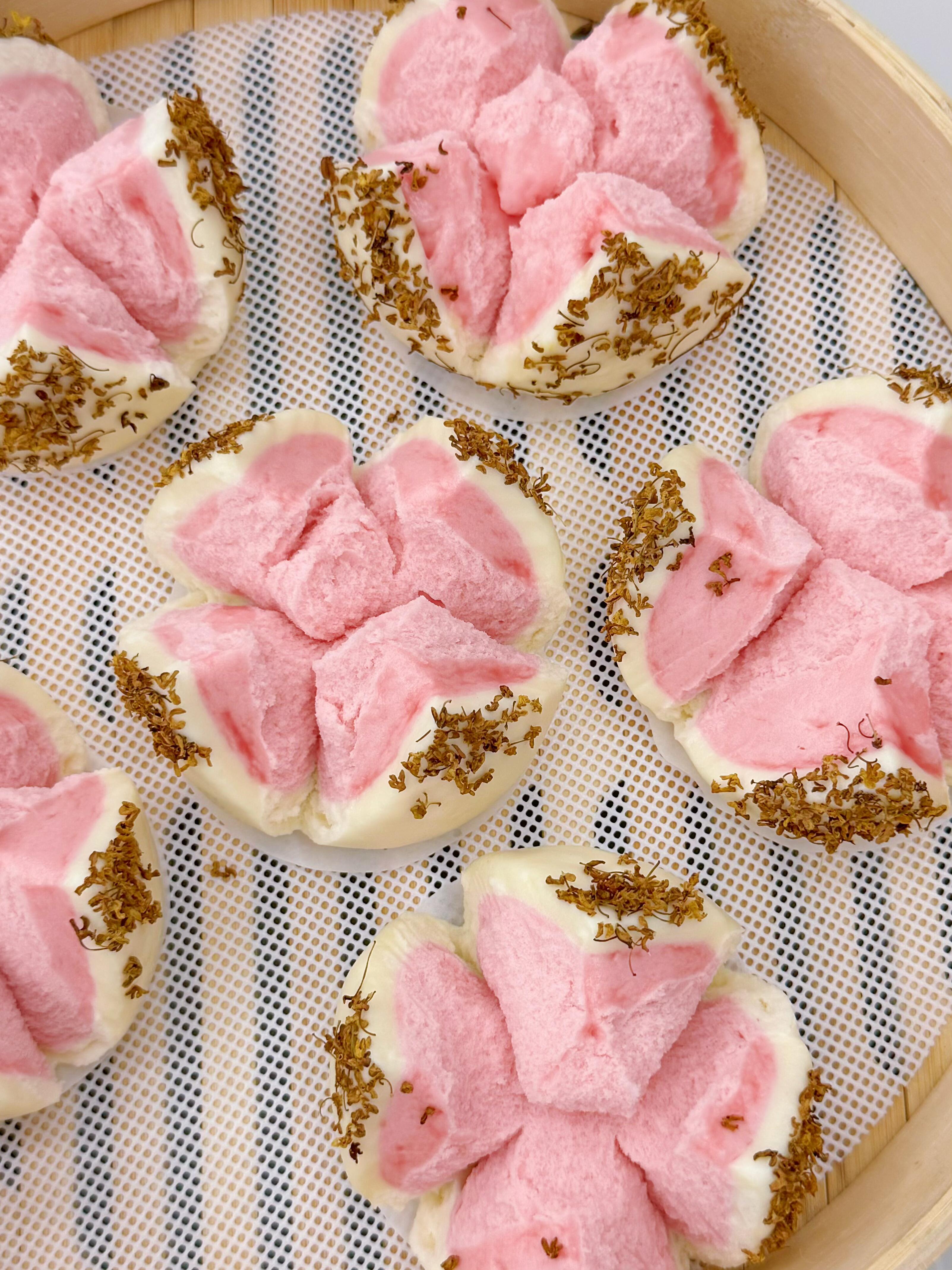 🌸 刚开盖的瞬间,就能看到一个个馒头都“开了花”,白色的外皮裂开,露出里面粉嫩的“花瓣”,桂花的香气混着馒头的麦香和奶香,整个厨房都飘着春天的味道。咬一口,馒头松软又有嚼劲,淡淡的甜味里带着桂花的清香,粉色的部分因为加了仙人掌果粉,还带着点天然的果香,无论是当早餐配豆浆,还是当下午茶小点心,都能把春日的美好吃进肚子里。