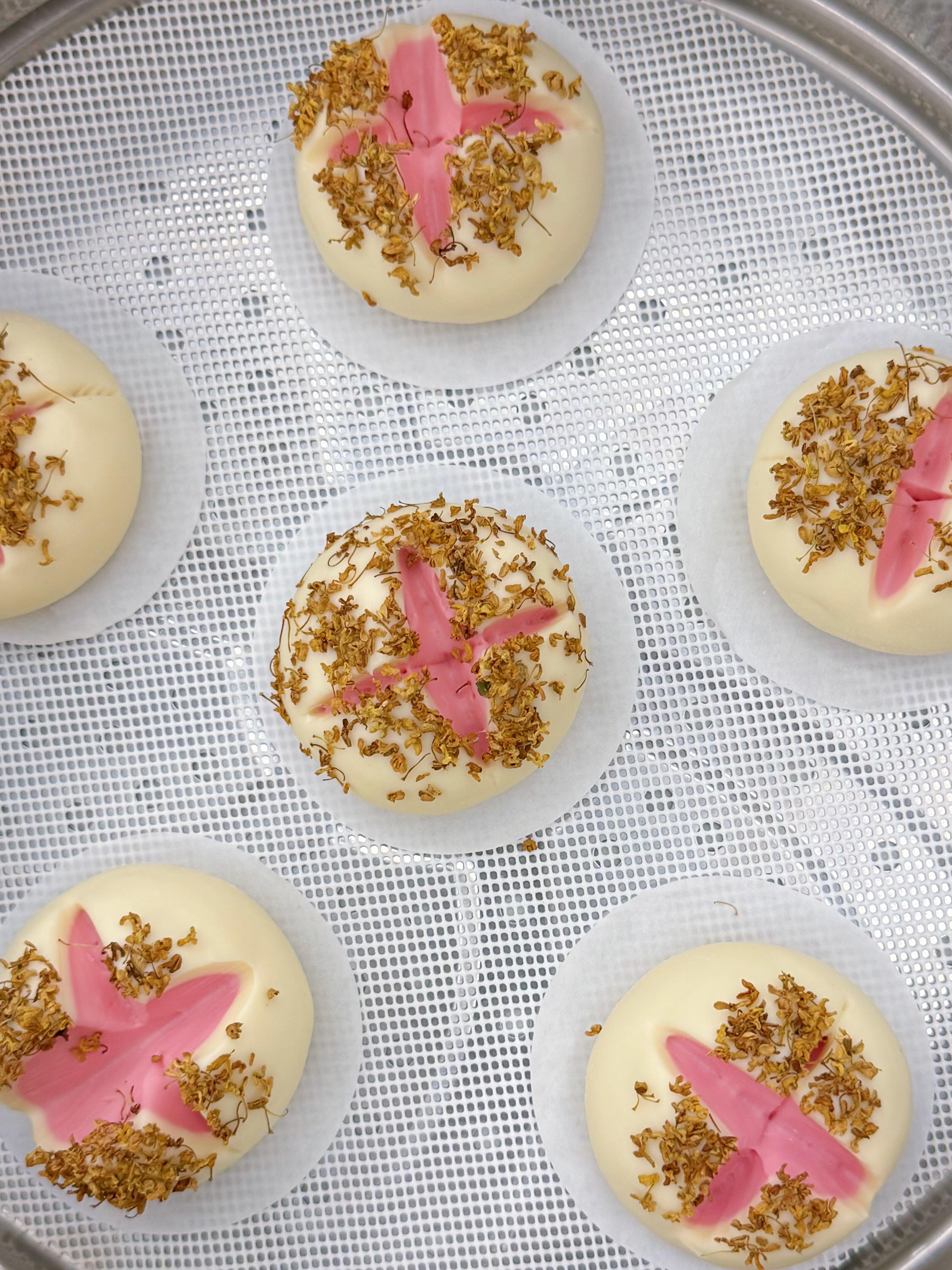 🌸 取一个白色小剂子,擀成边缘薄、中间厚的圆片,把粉色小球放在圆片中间,用虎口把白色面片往上收,紧紧捏合收口,翻过来就是一个白里包粉的小团子。用刀在团子顶部轻轻割一个十字,深度要刚好露出里面的粉色面团,再在表面刷一层清水,撒上干桂花,一个个待放的“花苞”就做好了。