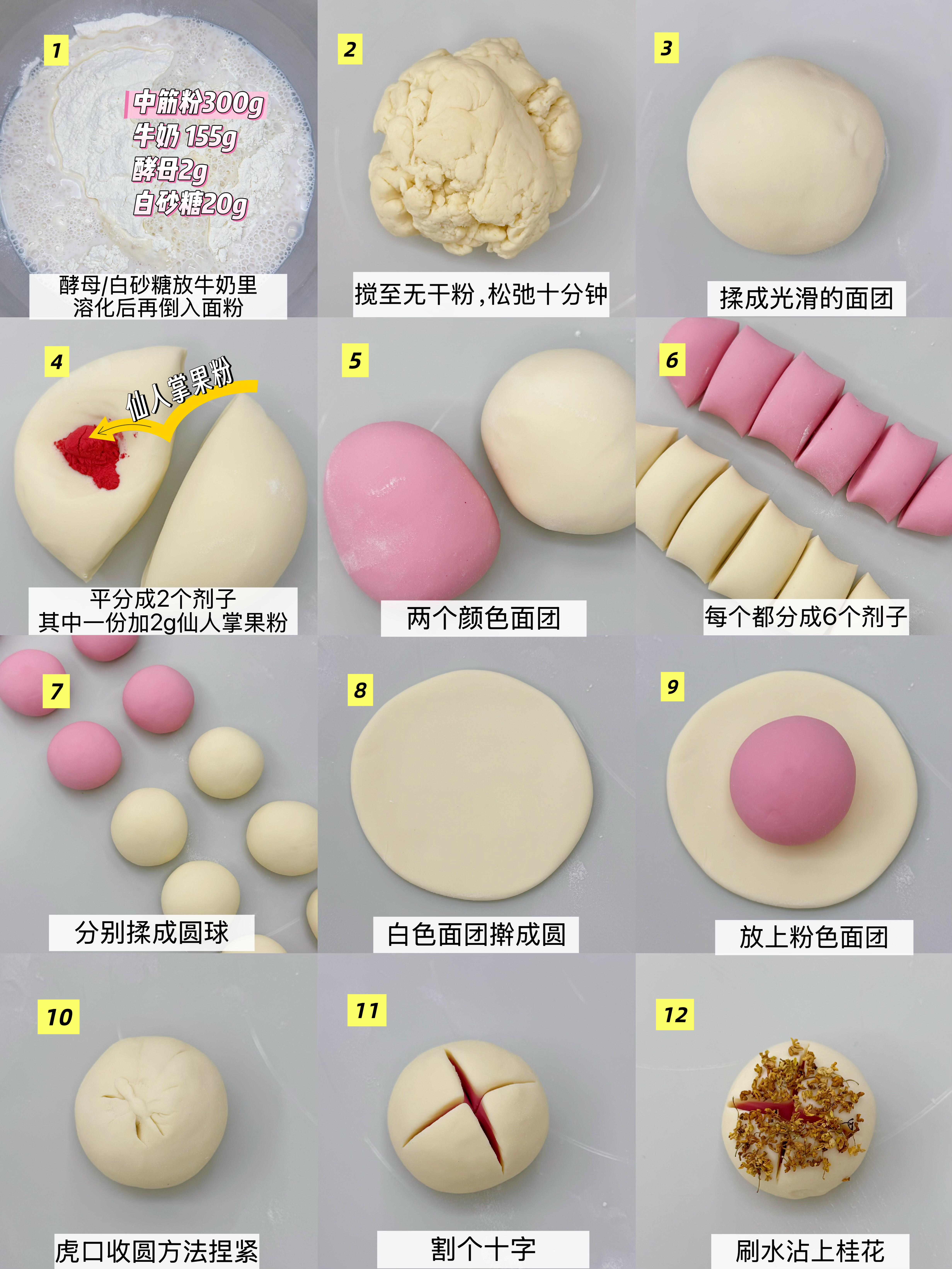 🌸接下来就是给馒头“穿上”春日粉外套的关键步骤啦!把面团平均分成两份,其中一份加入2g仙人掌果粉,反复揉匀,揉出一个粉粉嫩嫩的面团,另一份保持原有的奶白色。把两个颜色的面团分别分成6个小剂子,再把每个小剂子都揉成圆滚滚的小球,就像准备好的“花芯”和“花托”。