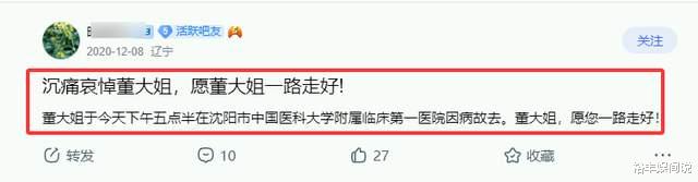 据悉,这则消息最早源于2020年12月8号的某贴吧,内容如下:沉痛哀悼董大姐,愿董大姐一路走好!董大姐于今天下午五点半在沈阳市中国医科大学附属临床第一医院因病故去。董大姐,愿您一路走好!