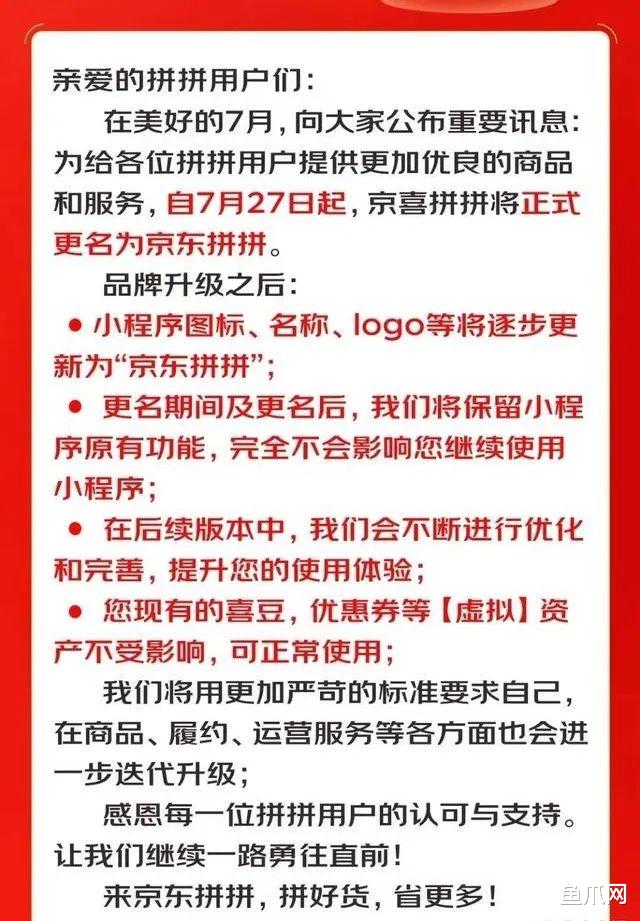 7 月 27 日起,京喜拼拼将正式更名为京东拼拼。品牌升级之后,京喜拼拼小程序图标、名称、logo 等将逐步更新为 " 京东拼拼 "。京喜拼拼为京东旗下的社区团购品牌。今年 6 月底,京东集团新成立创新零售部,整合拼拼、七鲜等业务成为独立业务单元,由此前负责京东国际的闫小兵担任负责人。京喜拼拼表示,品牌升级后将用更加严苛的标准要求自己,在商品、履约、运营服务等各方面也会进行迭代升级。看来京东对社区团购依然有着很浓厚的兴趣,并且未来还有可能增加投入,作为老互联网用户,您对未来的京东拼拼有信心吗?品牌升级为哪般?前面的文章我们提到过,一般企业升级商标都是为了品牌升级做准备,从一开始的京喜拼拼,到如今覆盖面更广的京东拼拼,究竟释放了哪些意图?京东拼拼的品牌升级,也是为了进一步丰富低价供给,挽回低价心智。整体来看,京东的低价战略转向,仍处于探索期。百亿补贴、第三方商家平权、物流系统的开放,乃至此次京东拼拼的上线,都是在找回低价方面的优势。