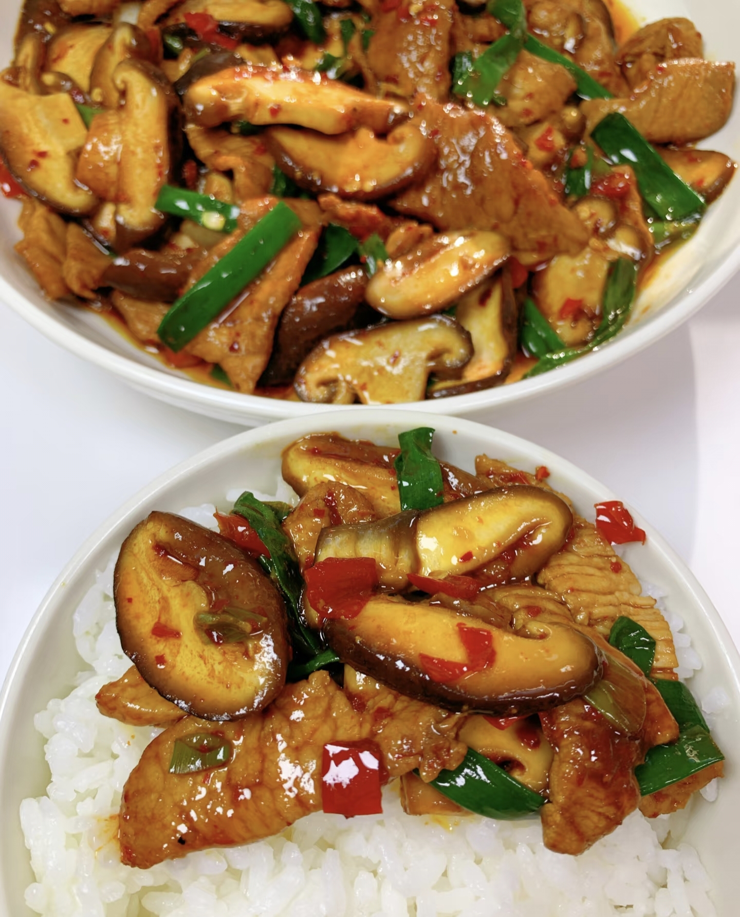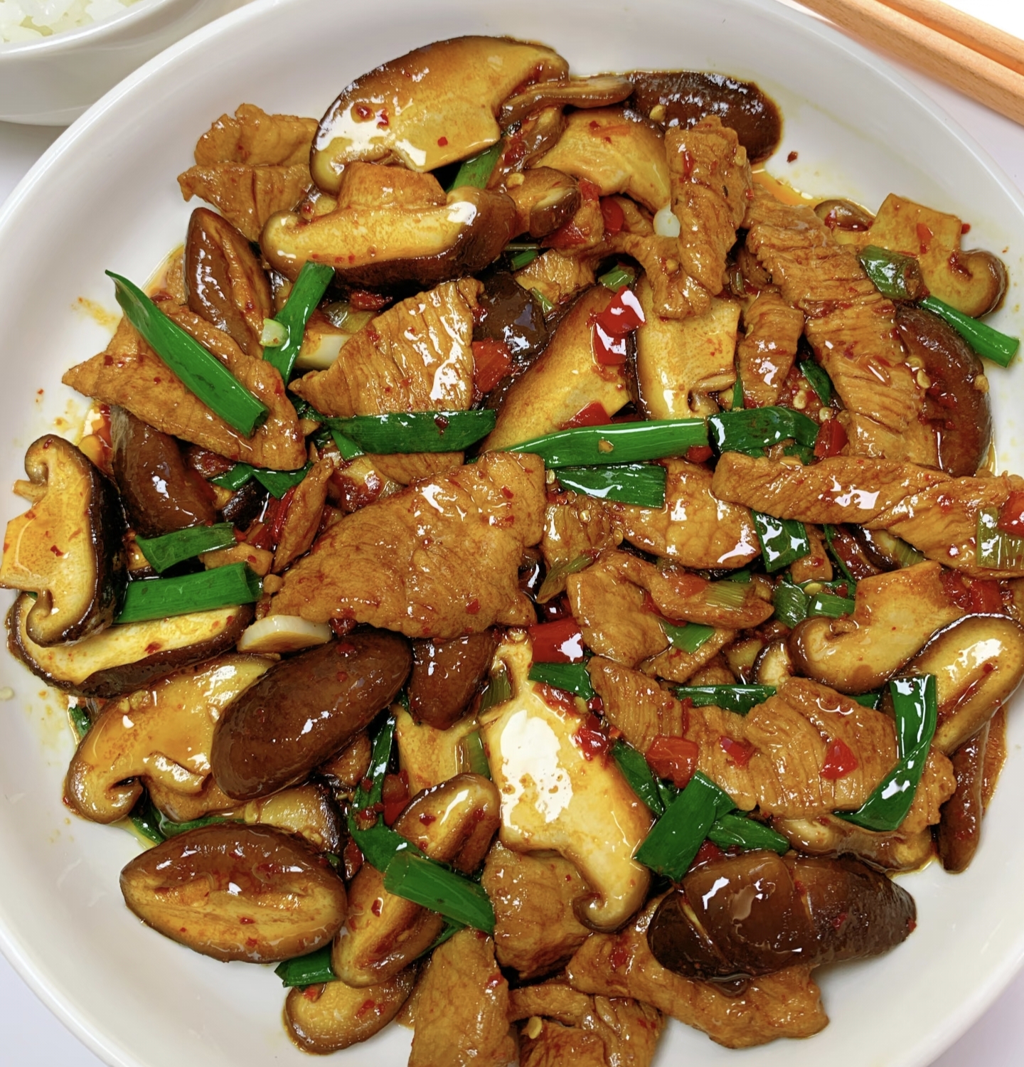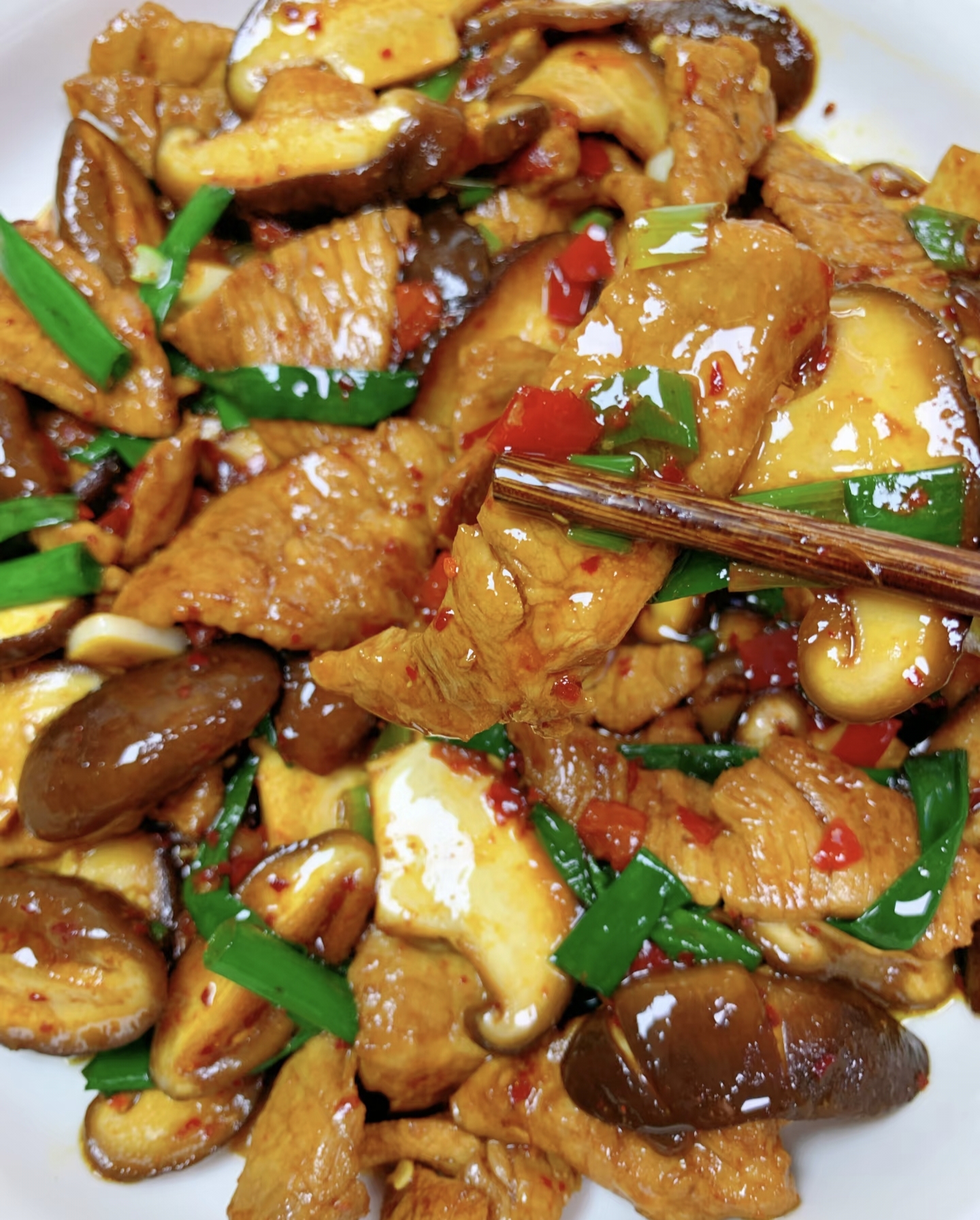 把肉片倒回锅中,加1勺蚝油+半勺生抽+半勺糖(提鲜神器),快速翻炒让每片肉都裹上酱汁。最后倒入青红椒和预留的香菇水,开大火收汁到浓稠,撒点白胡椒粉翻匀,关火!
