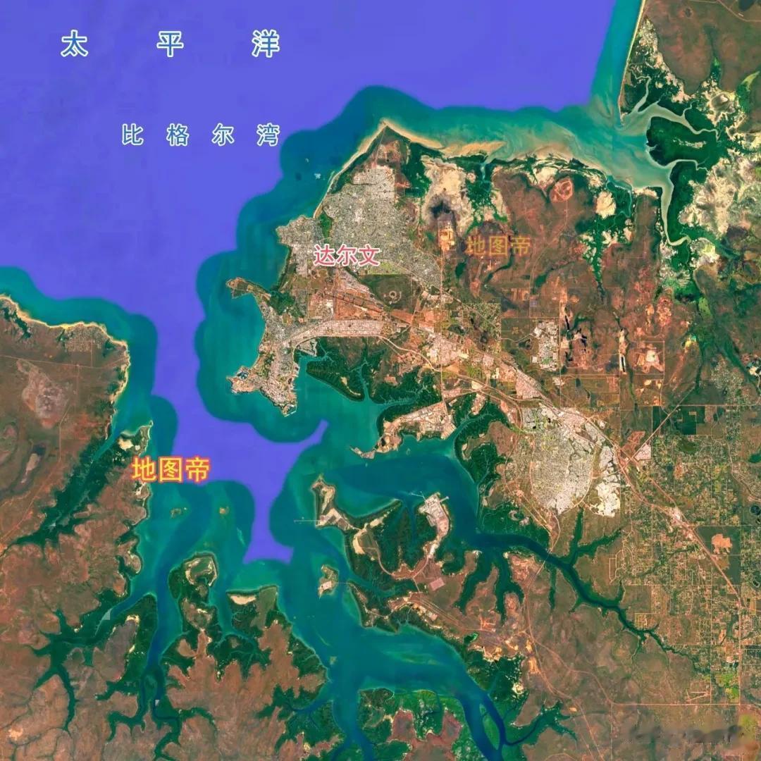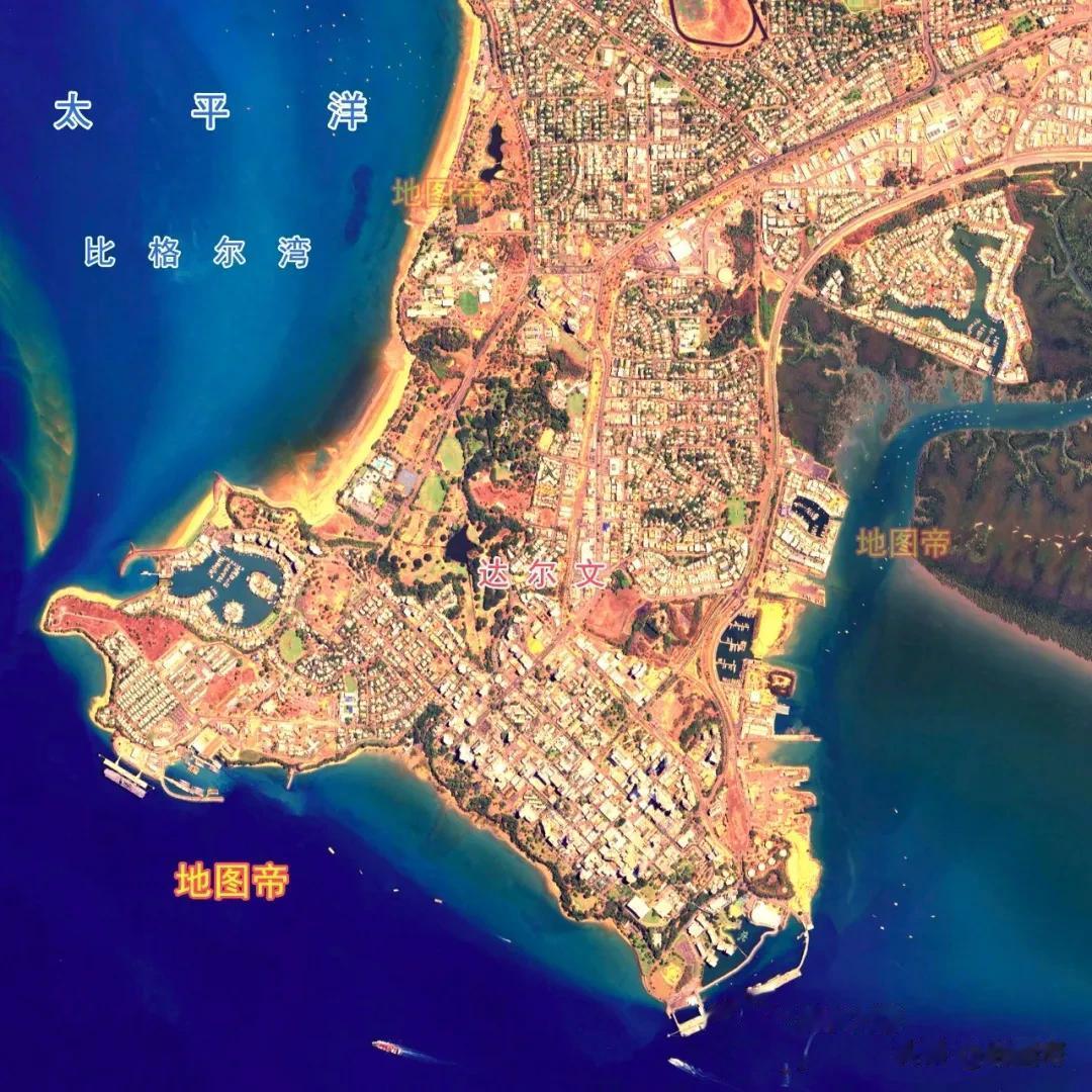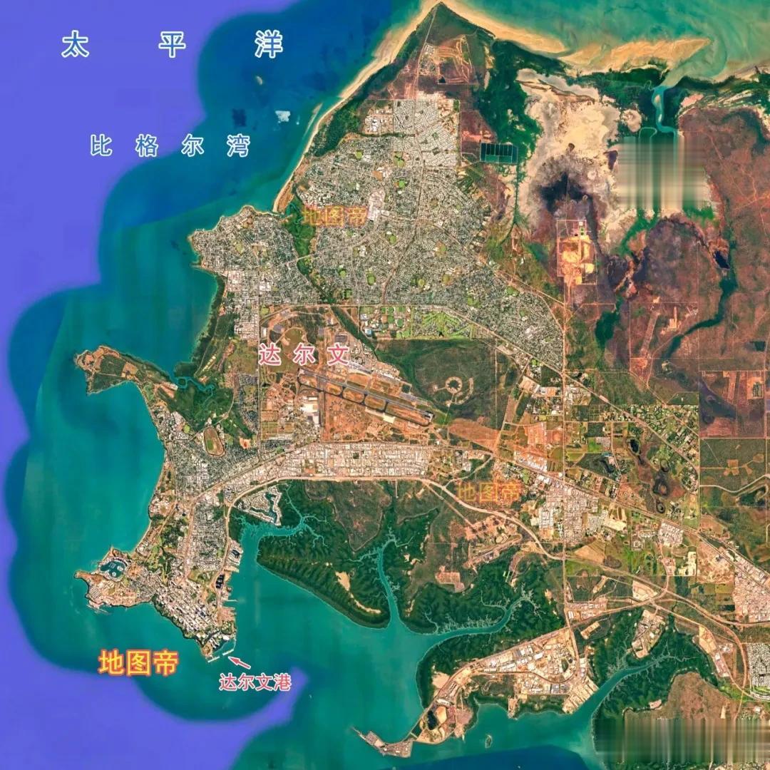 达尔文港在达尔文市南部,深入海湾,确实是深水良港。只可惜达尔文附近方圆上千公里人口太少,本地货运量极少,发展方向主要是通过铁路转运澳大利亚内陆的货物。