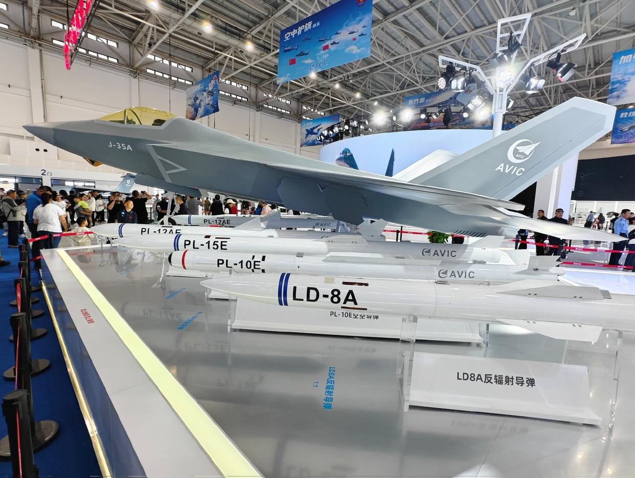 雷电-8A为外贸弹,摆在雷电-8A后面的霹雳-10E、霹雳-15E也是外贸弹,虽然说歼-35A本身也是考虑外贸的战斗机,和外贸弹摆在一起是很正常的。但歼-35A和反辐射导弹摆在一起就很不正常了,