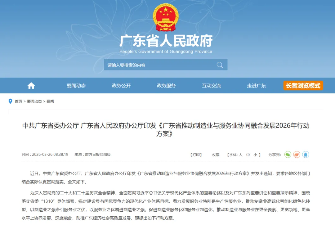 近日,中共广东省委办公厅、广东省人民政府办公厅正式印发《广东省推动制造业与服务业协同融合发展2026年行动方案》。从六个方面提出了21条具体政策举措,促进制造业服务化和服务业制造化,推动制造业与服务业在更全要素、更宽领域、更高水平上协同发展、深度融合。
