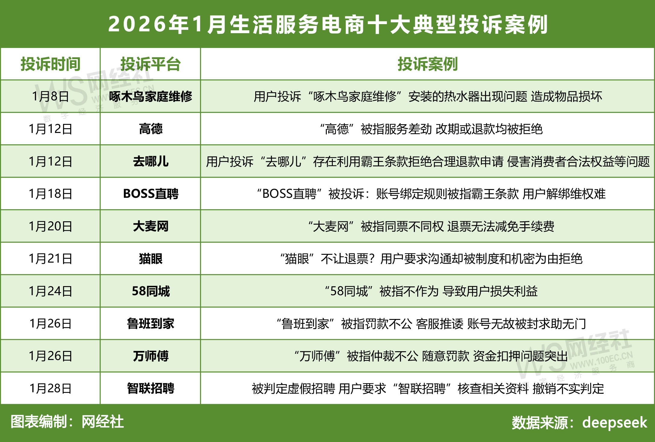 在生活服务电商消费领域,据“电诉宝”受理用户维权案例,我们从中选取十大典型投诉案例,涉及啄木鸟家庭维修、高德、去哪儿、BOSS直聘、大麦网、猫眼、58同城、鲁班到家、万师傅、智联招聘。