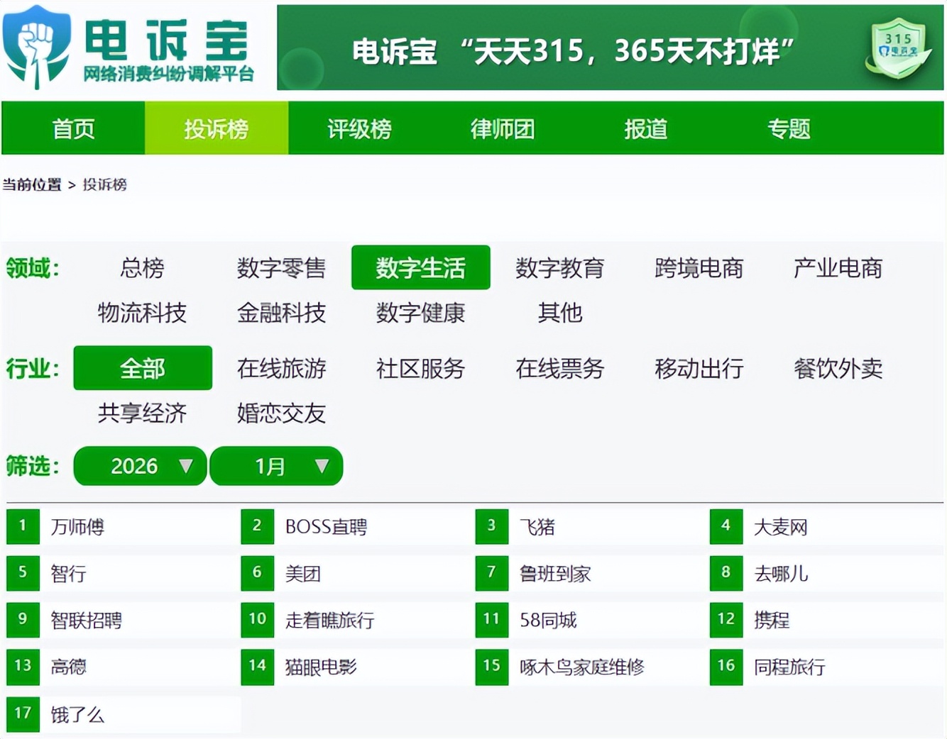 投诉量TOP10依次为:万师傅、BOSS直聘、飞猪、大麦网、智行、美团、鲁班到家、去哪儿、智联招聘、走着瞧旅行;