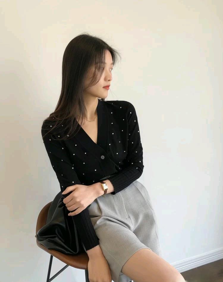 就拿这身搭配来说,上面的针织衫如果换成圆领的款式是不是就没有那么好看了?其实是因为上衣是鸡心领的原因,鸡心领偏时尚还能拉长脖颈,还有一个原因是裤子的材质是西装面料,这种面料会中和骑士裤原本的风格,加大时尚的效果。