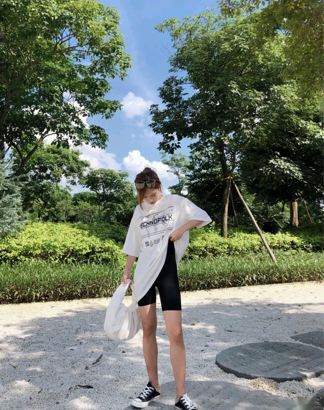 ,它有点像是短款的打底裤,但是上身十分舒适,上面穿一件简单的T恤衫就可以了,颜色随自己开心就好,选择一件能盖住臀部的上衣,简简单单的好看还不俗气。