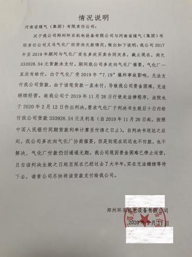 近日,河南永振机械设备有限公司、河南罗斯泵业有限公司、郑州环亚机电设备有限公司等多家小微企业向媒体反映,其与河南省煤气(集团)有限责任公司(以下简称“河南煤气集团”)及其下属义马气化厂的货款纠纷,经法院审理胜诉并进入执行程序后,遭遇长期执行推进缓慢的情况,双方此前签订的和解协议未能落实,部分企业因资金链承压陷入经营困境,员工生计受到影响。