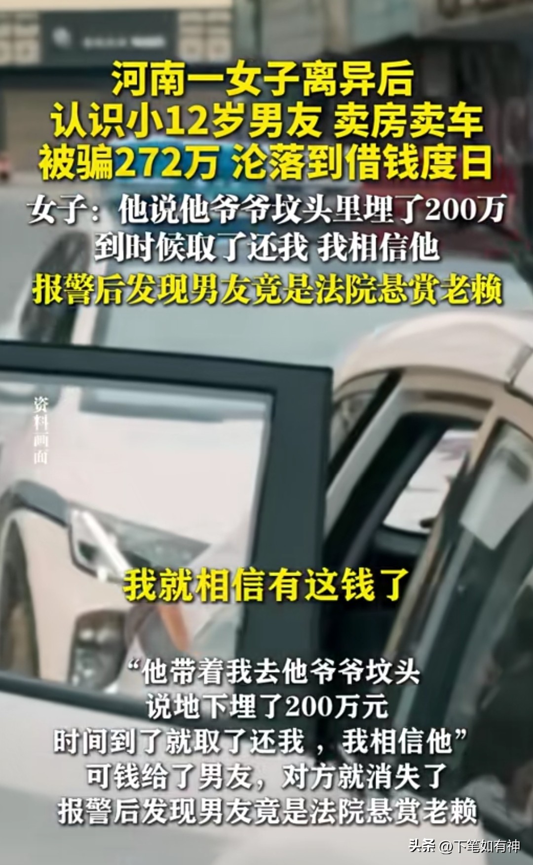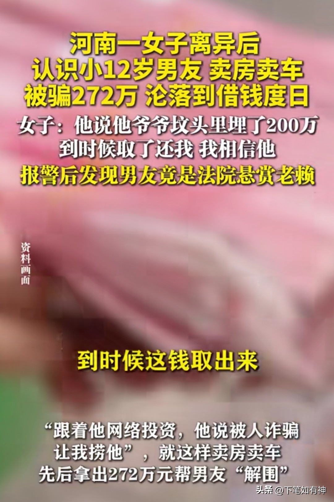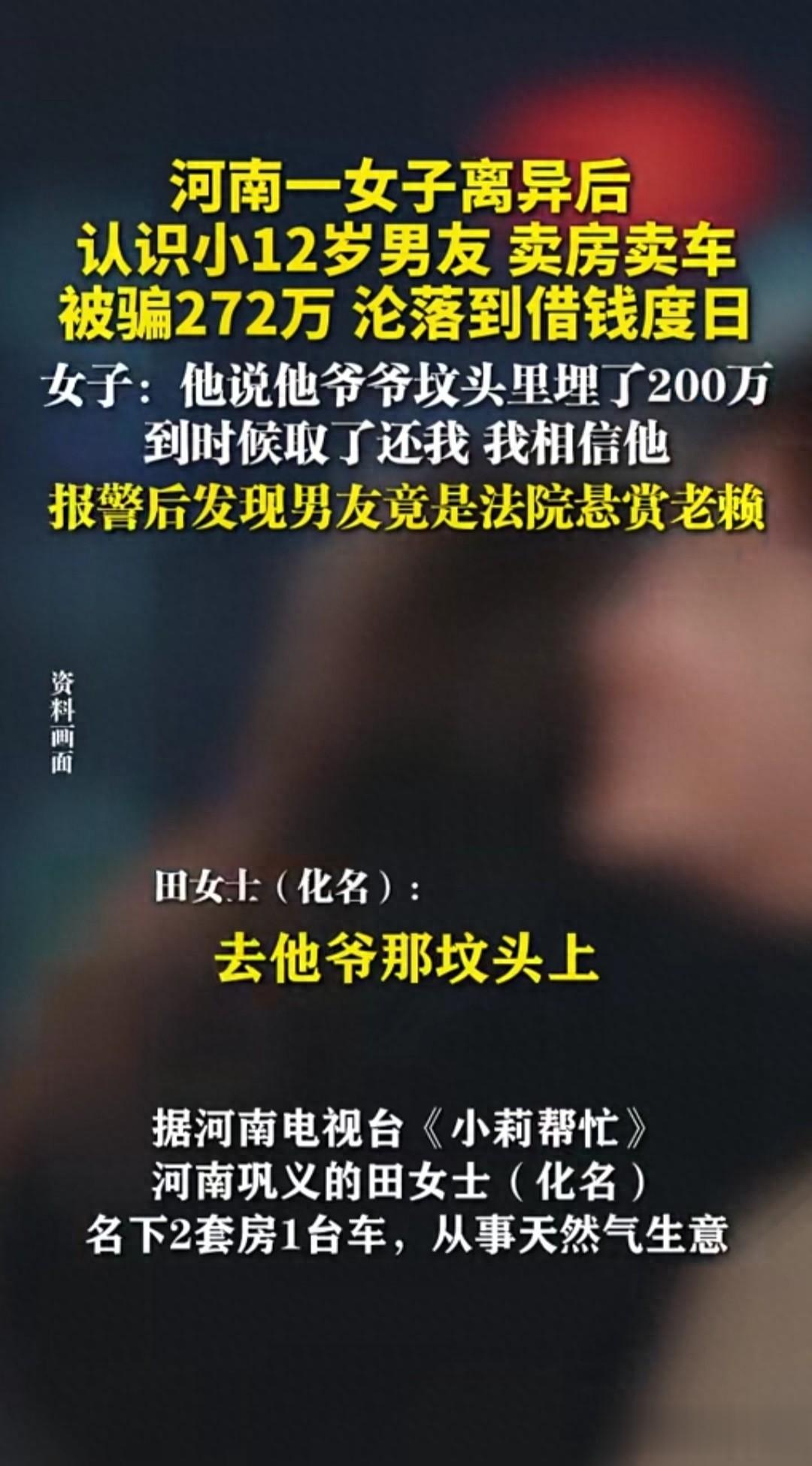 近日,河南田女士(化名)离异后认识了小12岁的男友,为其卖房卖车,被骗272万,沦落到靠借钱过日子,在网上引发热议!