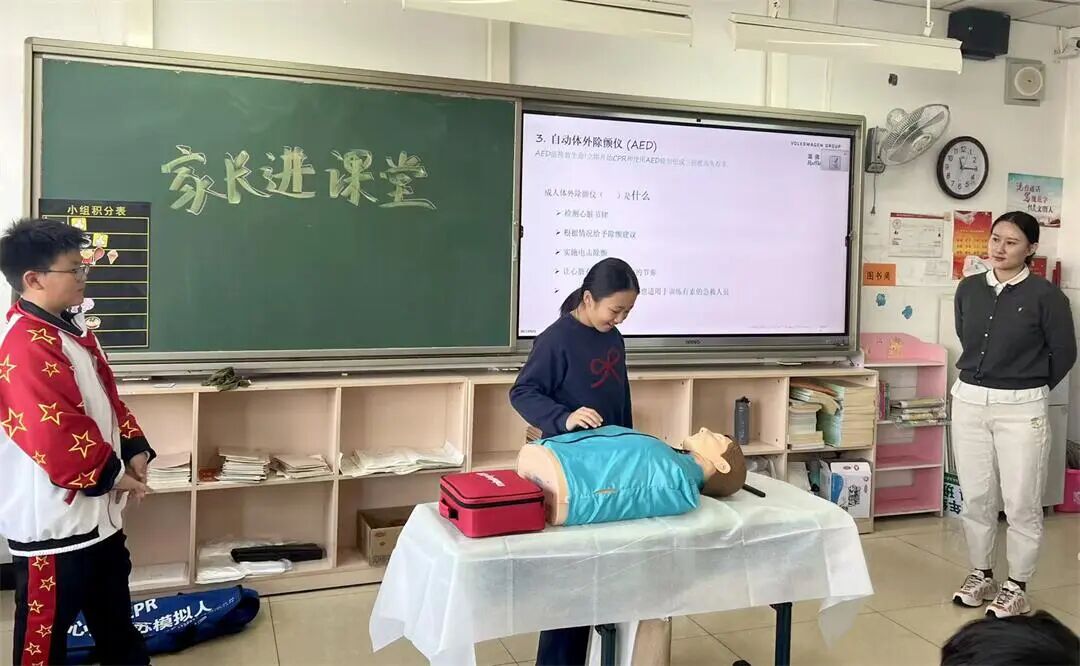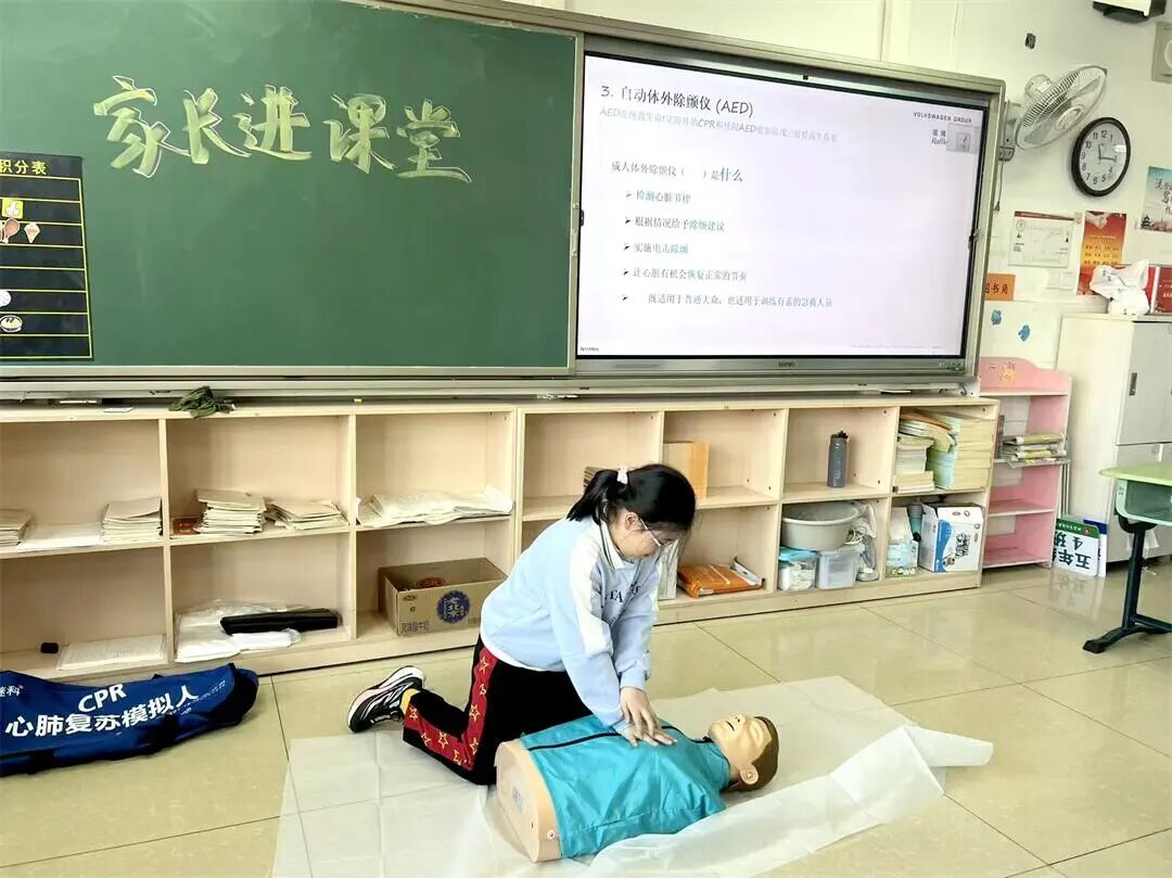 当日,该班学生黄茗瀚的妈妈——一位专业的急救科普工作者,受邀走进课堂,为孩子们带来了生动的心肺复苏(CPR)与体外除颤仪(AED)使用培训。与传统理论授课不同,这位“家长讲师”带来了急救模拟人、AED教学设备等教具,通过边讲解边演示边实操的方式,将专业的急救知识转化为一堂孩子们喜闻乐见的“实战课”。