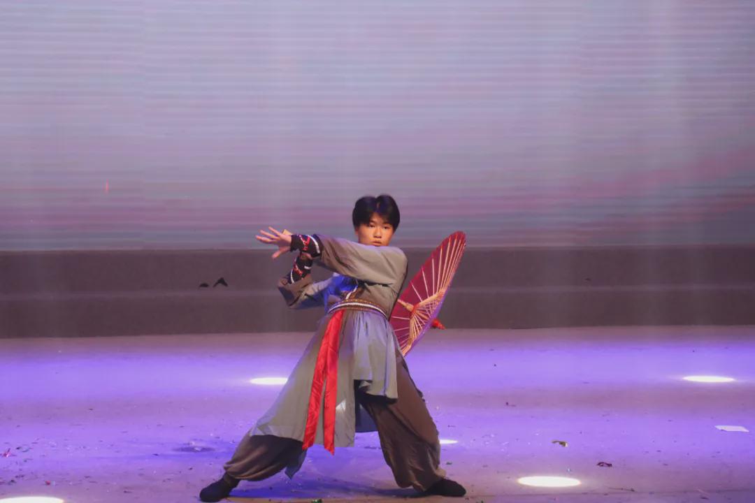 《侠骨伞影》中,舞者手持油纸伞,一招一式刚柔并济,将武侠世界的豪情与柔情展现得淋漓尽致,尽显学生们的青春风采。