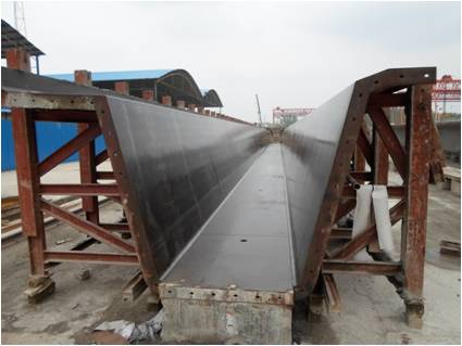 2.3、内膜安装:内膜也是用5mm的钢板制成的定型模板,人工配合龙门吊安装内膜,相邻节间用螺栓固定。