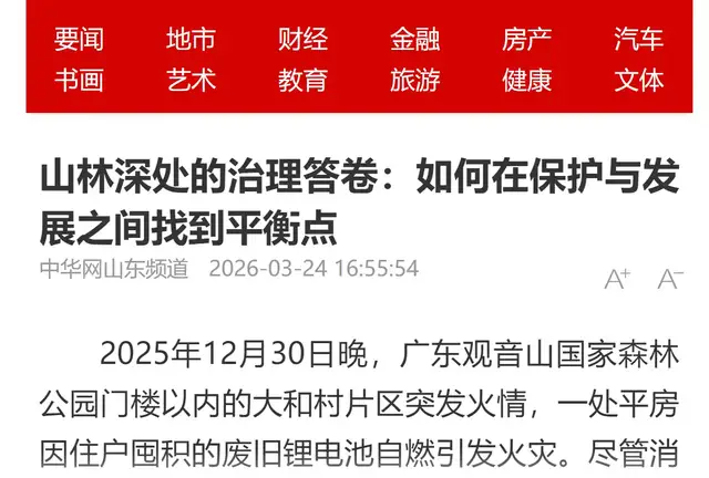 2025年12月30日晚,广东观音山国家森林公园(东莞观音山)门楼以内的大和村片区突发火情,一处平房因住户囤积的废旧锂电池自燃引发火灾。