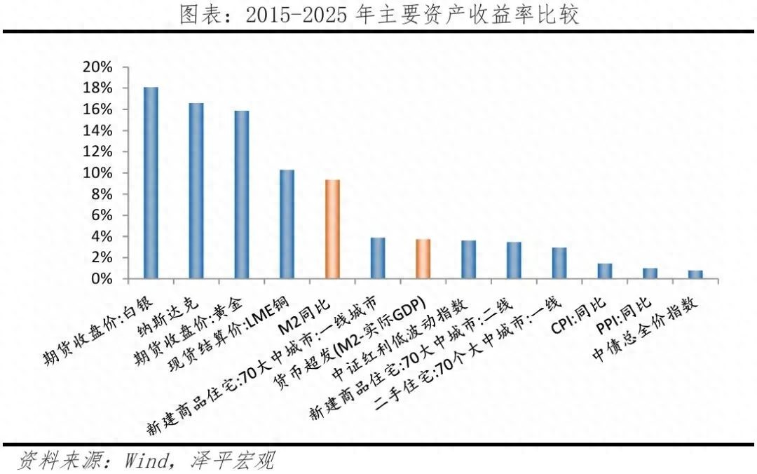 文 任泽平在现代社会,货币超发是全球普遍现象,长期持有固定收益类产品将大幅跑输货币超发,财富被稀释。从1960年到2024年,全球广义货币占GDP的比重上升了92个点到141%,多数经济体广义货币年均增速高于其名义GDP增速。我在十多年前提出,”三大硬通货,长期跑赢印钞机“,这是货币超发时代的诺亚方舟,更是普通人做好资产配置的底层逻辑。1、供给稀缺的贵金属及矿产资源,以黄金、白银、有色金属、稀土等战略矿产资源为代表。在所有资产中,大宗商品是最有能力长期跑赢货币超发甚至M2的品类,其价格高回报的核心逻辑,在于全球流动性宽松、信用扩张、供给受约束与地缘冲突的多重共振。2025-2026年,这类资产将迎来大周期爆发,本质是货币宽松、需求增长与供给约束形成三重共振: