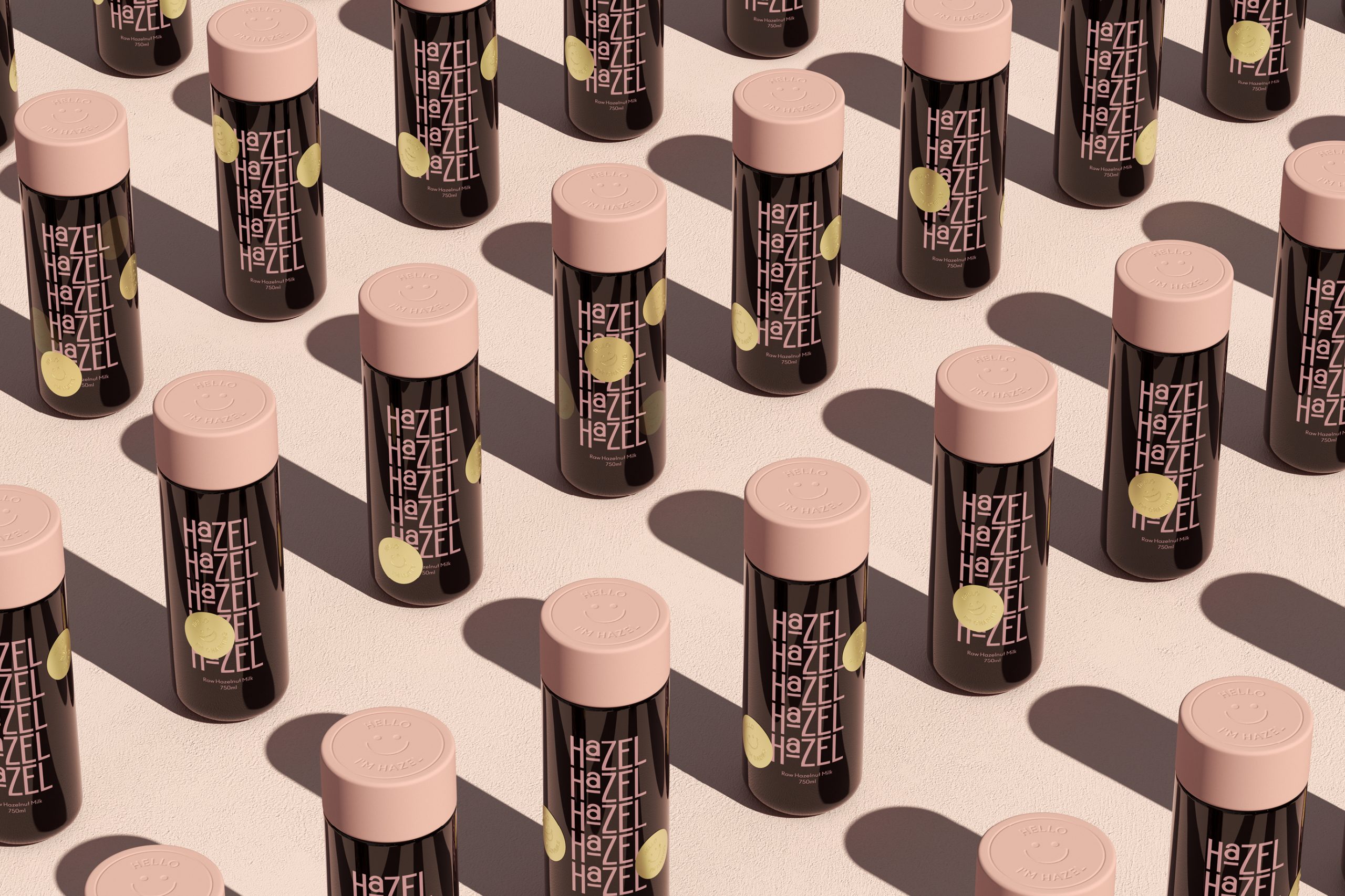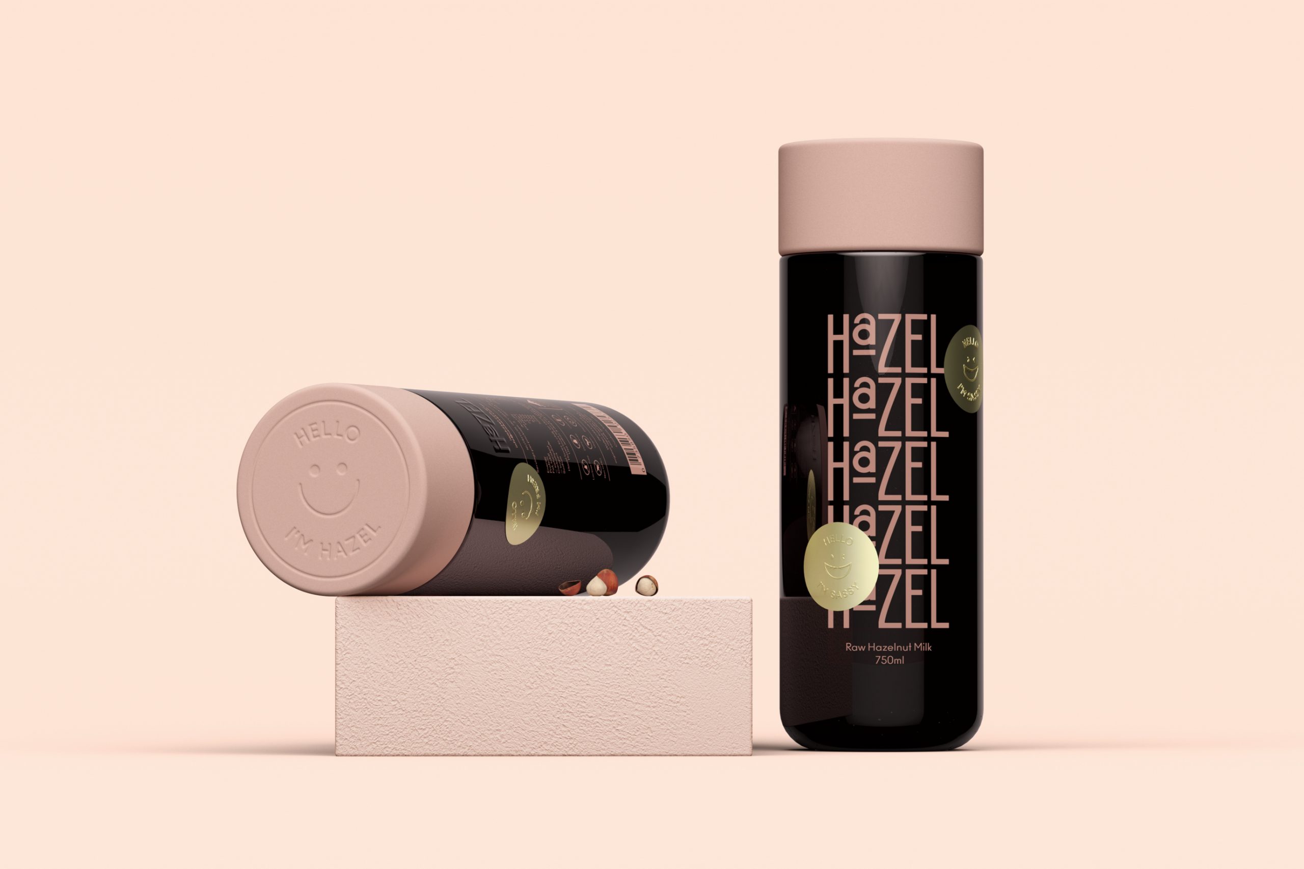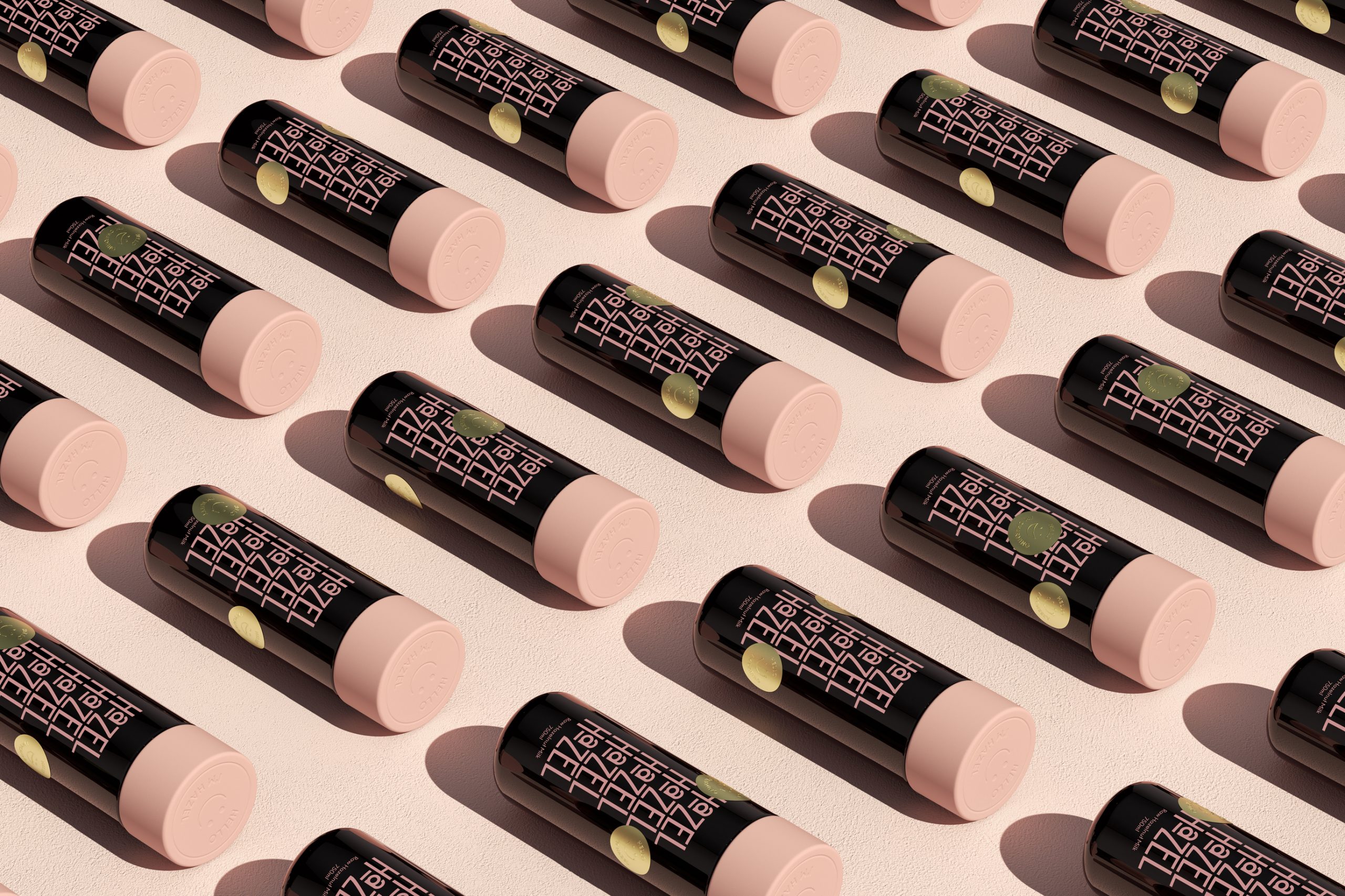 Hazel的包装设计则展现了另一种风格——趣味与实用的巧妙融合。黑色的瓶身搭配粉色的瓶盖,形成强烈的色彩对比,吸引眼球。瓶身上重复排列的品牌名称“Hazel”以有趣的方式呈现,增加了视觉趣味性。此外,包装上的笑脸图案和“Hello I'm Hazel”字样,传递出友好和亲切的品牌形象。这种设计不仅让包装在货架上脱颖而出,还增强了消费者的购买欲望和品牌记忆点。