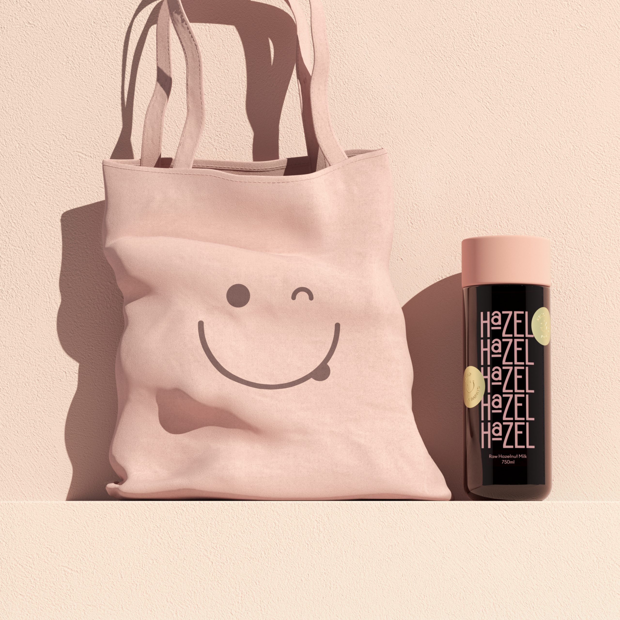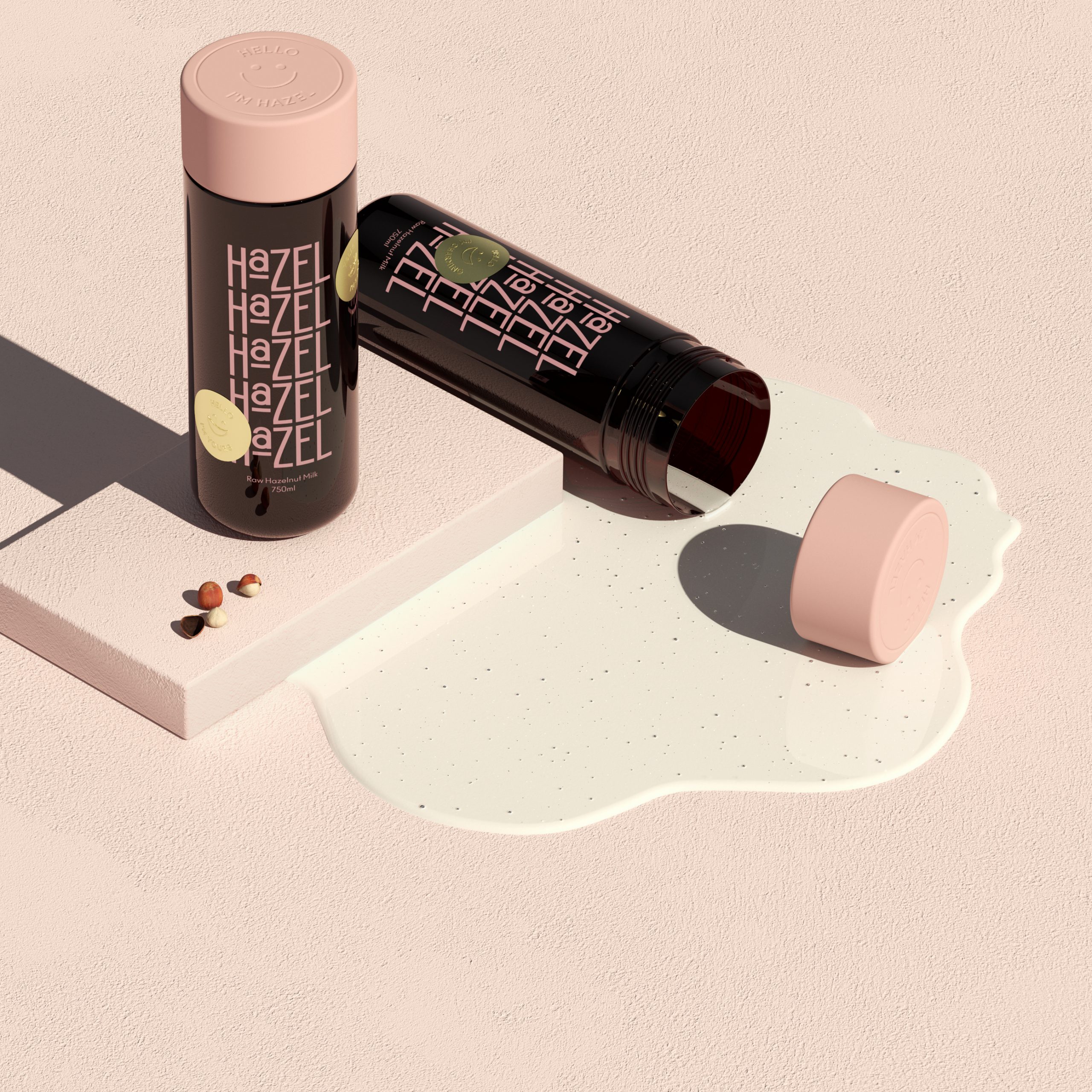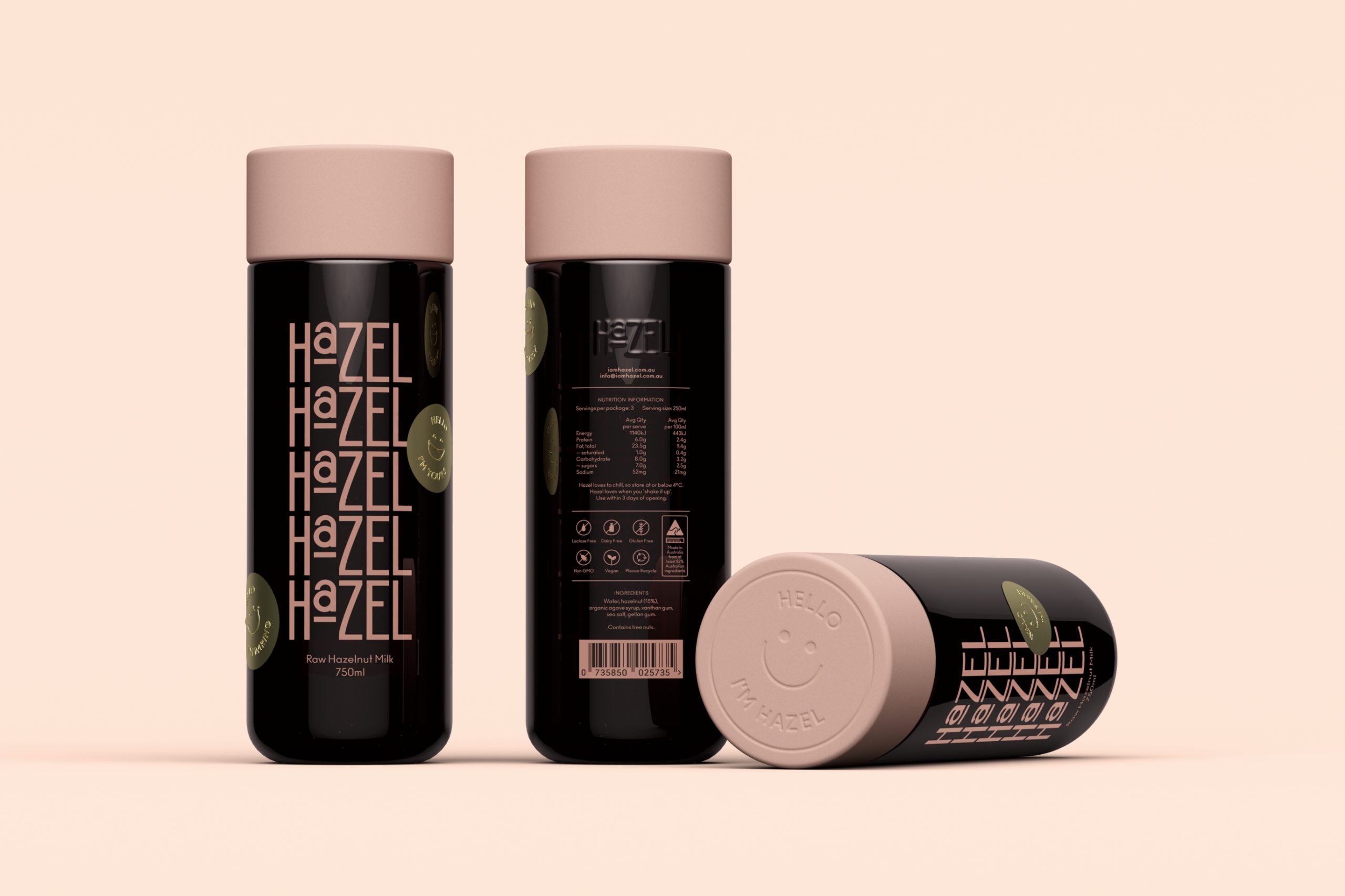 Hazel的包装设计则展现了另一种风格——趣味与实用的巧妙融合。黑色的瓶身搭配粉色的瓶盖,形成强烈的色彩对比,吸引眼球。瓶身上重复排列的品牌名称“Hazel”以有趣的方式呈现,增加了视觉趣味性。此外,包装上的笑脸图案和“Hello I'm Hazel”字样,传递出友好和亲切的品牌形象。这种设计不仅让包装在货架上脱颖而出,还增强了消费者的购买欲望和品牌记忆点。
