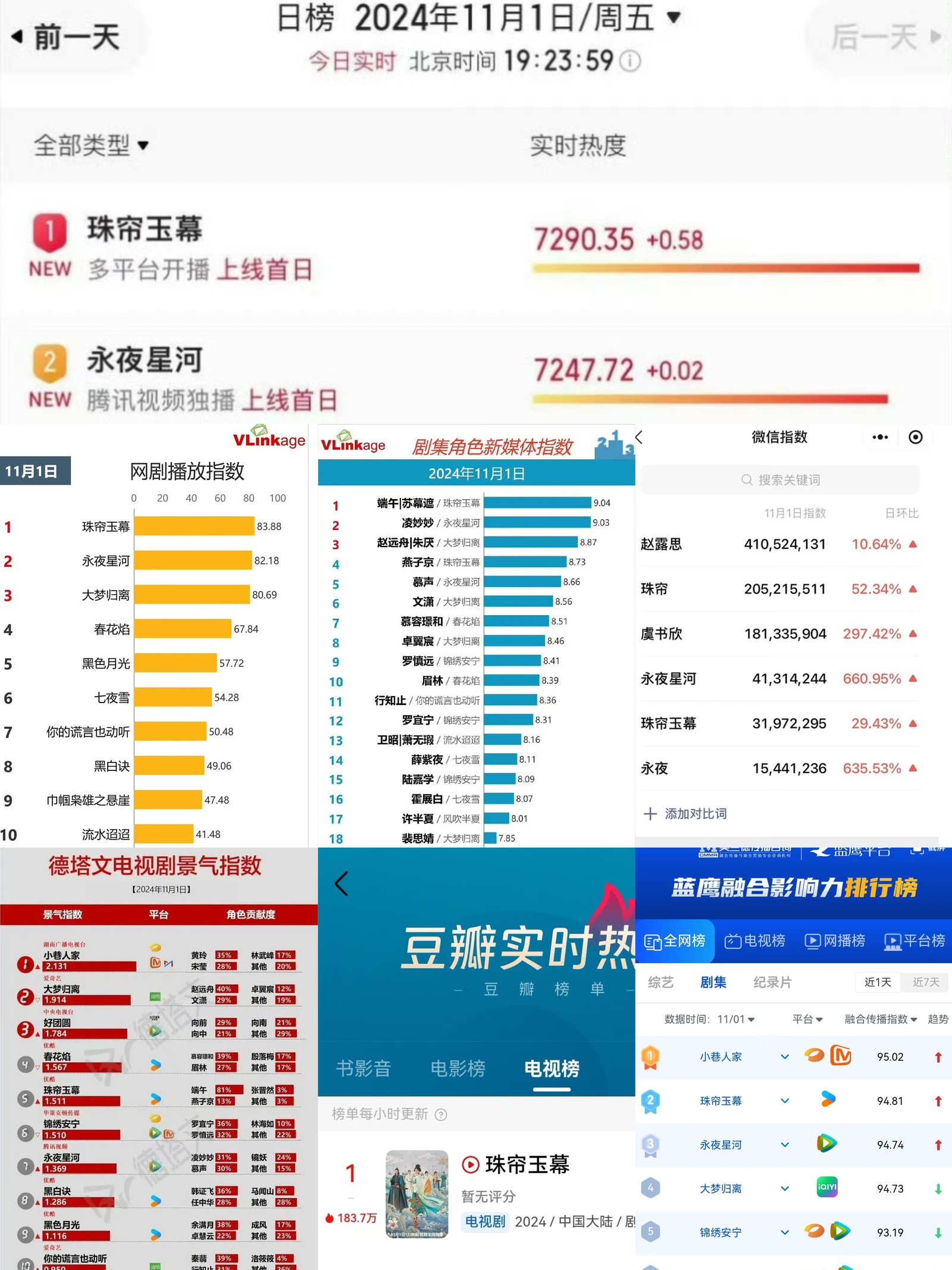 从最新首播的数据来看,《珠帘玉幕》可以说是遥遥领先了,各大平台榜单呈现出来的数据都名列前茅,微信指数、猫眼热度、v榜指数......全都被珠帘承包了,各种开门红榜单直接霸屏,这碾压程度实在是有点强了。