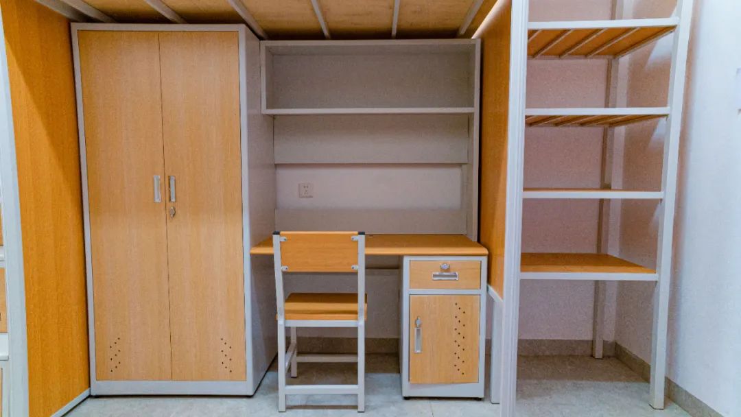 宿舍内部,上床下桌,拥有单独的衣柜和书桌,而且都是木质的。