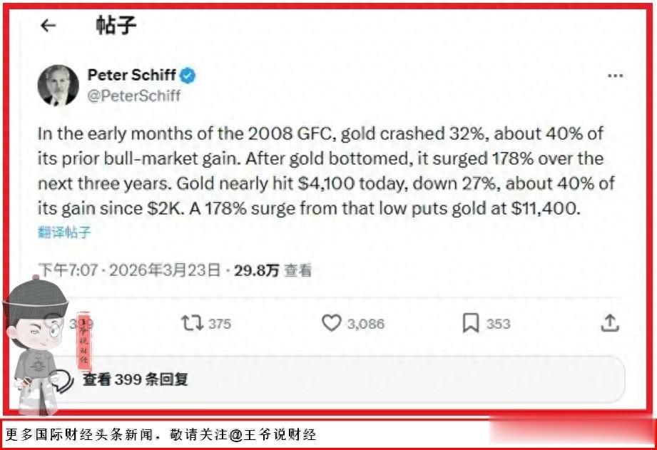 “黄金正重演 2008年剧本” 是华尔街分析师彼得・希夫提出的观点,核心是:当前黄金的暴跌是流动性危机下的 “错杀”,与 2008 年金融危机初期走势高度相似,暴跌后大概率迎来史诗级反弹。