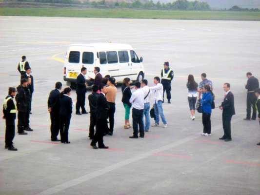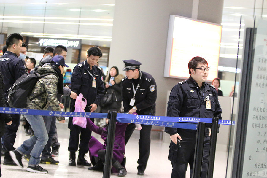 眼看围观群众越聚集越多,不远处几个穿制服的地勤突然小跑过来维持秩序。