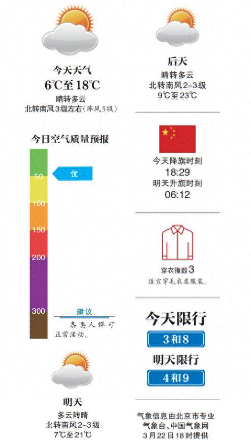 据“气象北京”消息,今天(3月23日)白天多云间晴,北风一级转南风三级左右(阵风五级左右),最高气温18℃;夜间多云间晴,南转北风一二级,最低气温6℃。今天午后阵风较大,请注意防风防火。