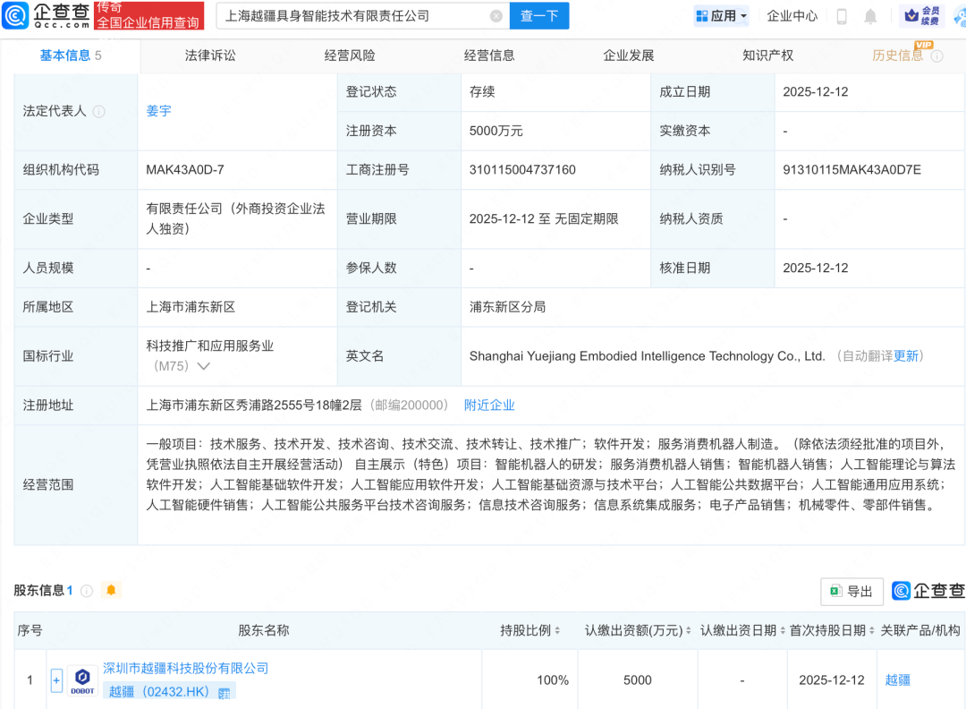 近日,企查查APP显示,上海越疆具身智能技术有限责任公司成立。股权穿透显示,该公司由越疆全资持股。