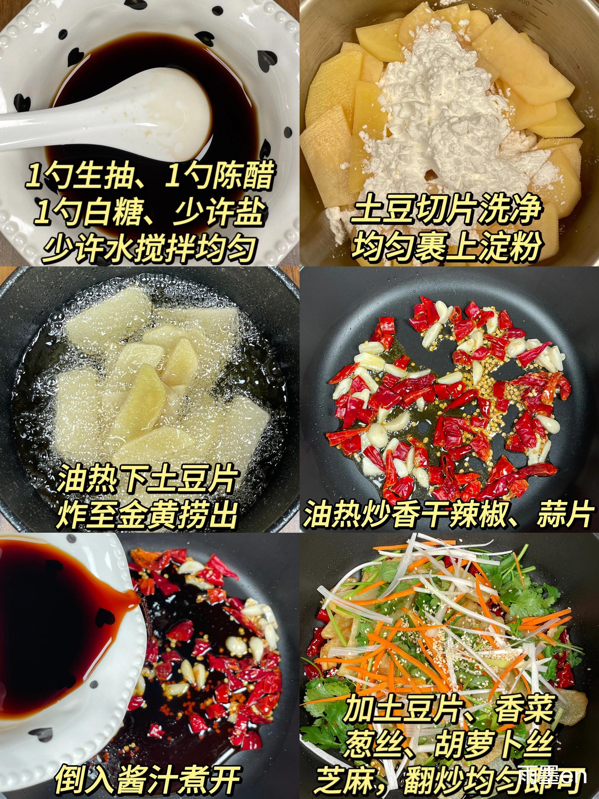 炒到土豆片变得半透明、边缘微焦时,盛出来备用。锅里留少许底油,放入蒜末、小米辣圈,喜欢麻味的可以加一小撮花椒,小火慢慢炒出香味,千万别炒糊蒜末,不然会发苦。接着倒入炒好的土豆片,转大火快速翻拌,然后开始调味:2勺生抽提鲜、1.5勺陈醋增酸、半勺白糖中和口感、少许盐和花椒粉调味,翻炒均匀让每片土豆都裹满酱汁。