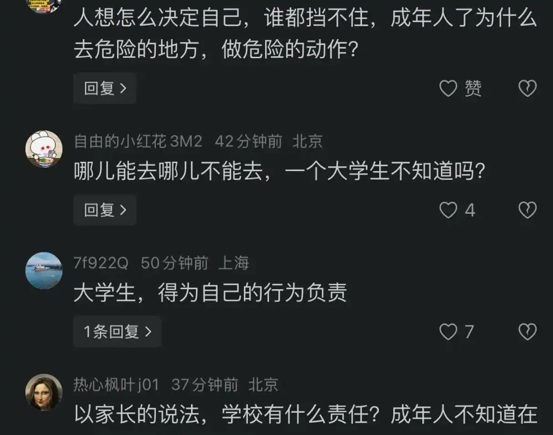 “咱送孩子去大学,图的是安全和教育,不是看学校墙上挂了多少牌子。” 一位有大学生的家长在评论区留言,“别说天台该封闭,就算是普通楼道,课间也该有老师或保安巡查吧?这不是基本的管理常识吗?”
