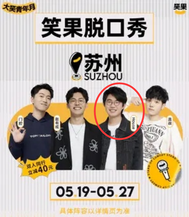 据悉,5月19日,笑果文化本在苏州有一场演出,原定演员名单中也有House,风波之后,House自然被正式除名。