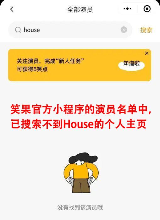 除此之外,House的个人账号也已经被官方封禁,在笑果官方微信小程序的演员名单中,House的名字与词条都不复存在。