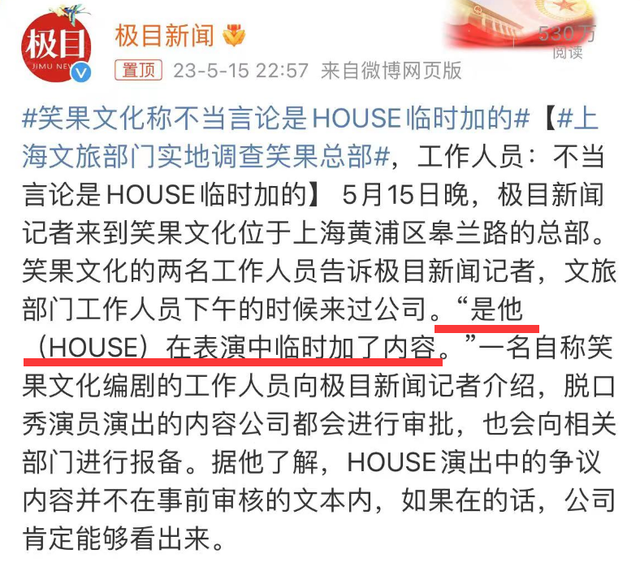 眼下这件事依旧在持续发酵中,在此期间有记者特意采访了笑果文化的工作人员,工作人员在采访中表示这些引发争议的内容是House在表演时临时加的内容。