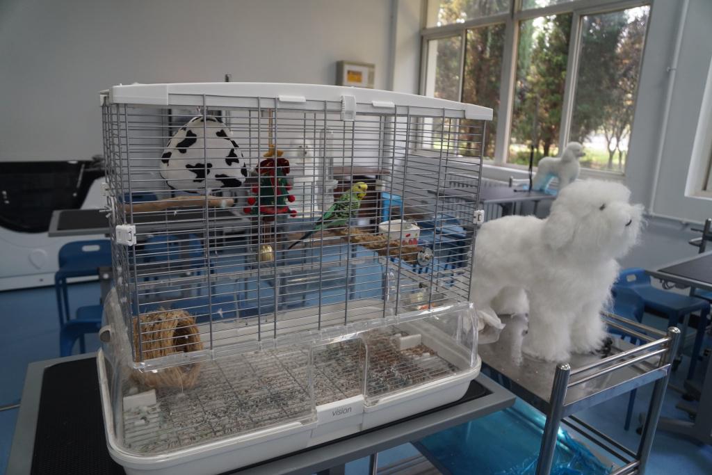 在位于教学楼一楼的训导教室,小兹的犬舍靠窗摆放,教室中间的课桌上则有一个鹦鹉笼。此外每张课桌旁都放着一只白色仿真小狗,用于宠物美容教学。教室靠近走廊的一侧是落地玻璃墙。“每次上训导课,玻璃墙前都挤满了其他专业的同学,他们可羡慕我们能和宠物一起上课了!”沙梦莹骄傲地说。