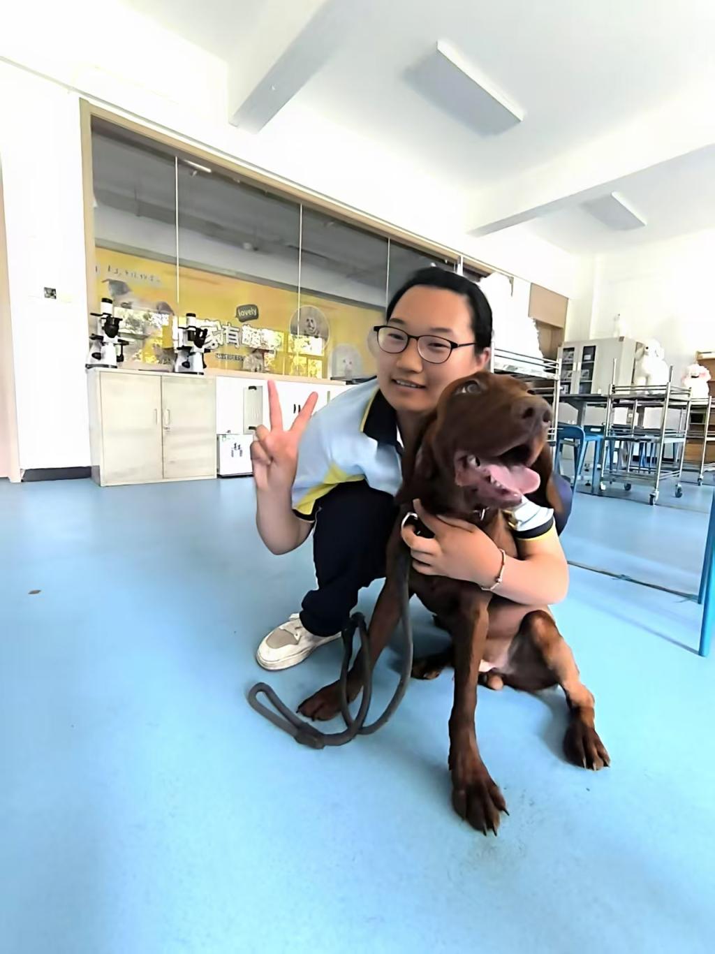 训导教室里有位常驻“助教”——一只名叫“小兹”的维兹拉犬。这只纯棕色的小狗是全班同学的“团宠”,沙梦莹和同学们经常带它在校园里遛弯儿,几乎每天都给它带来各种好吃的零食。这学期有一门课是宠物营养课,同学们各显身手,做了很多宠物饼干,小兹自然近水楼台先得月,每天吃到肚滚腰圆。宠物训导课是沙梦莹和同学们最钟情的课程。班里不少像她一样的走读生,可以带着自家宠物来上课,小狗、小猫、小鹦鹉……这些“小助教”备受学生们的尊重。沙梦莹说:“最多的一次,课堂上有五只小狗和一只小猫当‘助教’。”这些课堂上的小伙伴还成了好朋友,主人们周末会相约让它们凑在一起玩耍。